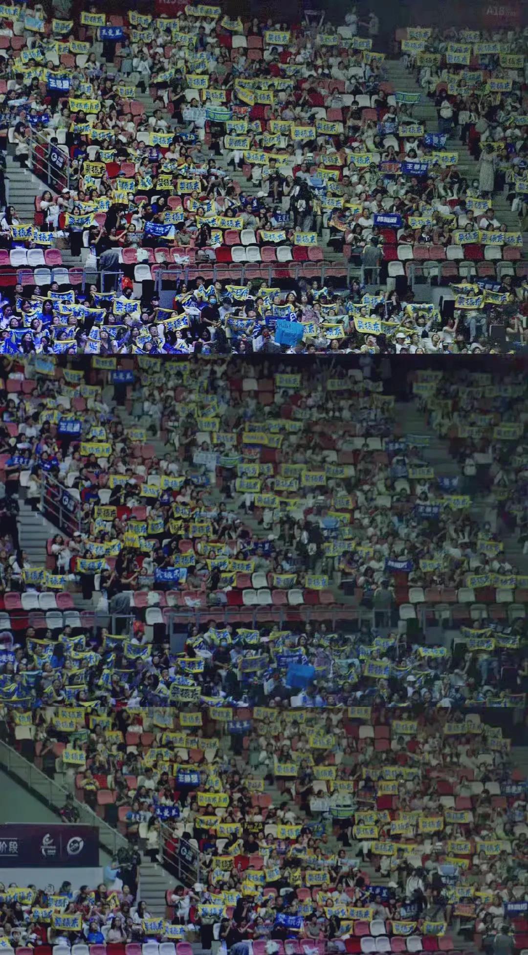 听到现场一女的喊:妈呀!全是我们家的。全场一片黄色的樊星海洋,中间夹杂着王曼昱的