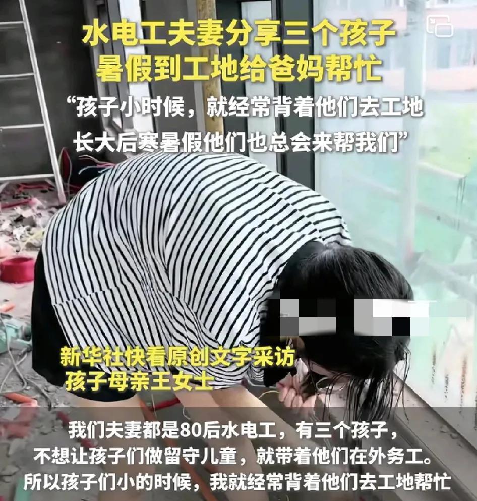网友分享暑假期间自己三个孩子来到工地帮自己的忙,感觉到特别的踏实。因为不想孩子做留守儿童自小就带着他们到外地务工,小时候还背着他们在工地上干活,长大了他们寒暑假都会过来帮忙。大家看到几个孩子对于工地上的工作都很熟练,觉得他们太懂事了。没准那也是一门手艺活,学会了对自己以后踏进社会也是非常有帮助的。