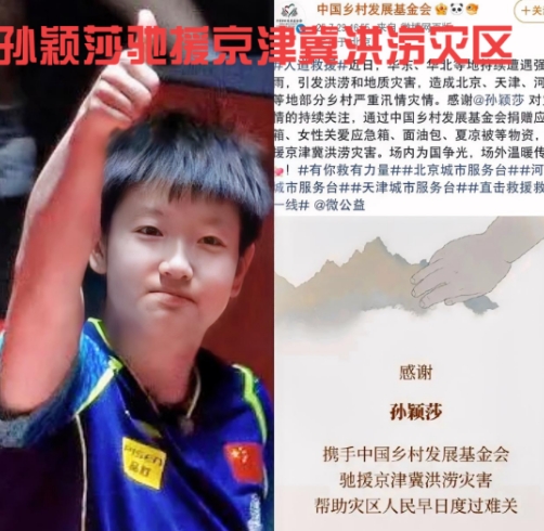 近期当北方暴雨京冀津遇到洪灾的时候,孙颖莎第一时间为灾区捐物,为爱心满满的孙颖莎点赞!优秀的孙颖莎正能量的领跑者!祝贺孙颖莎连续四年再次夺得世界乒乓球女子单打排名第一!积分11250分,再次过万再次打破自己保持的世界纪录!恭喜孙颖莎多哈世乒赛混双三连冠,成为首位荣获赫杜克复刻杯的国际顶级优秀球员!恭喜优秀的女孩孙颖莎入选全国青联提名!优秀的莎莎自律、坚定自信、永不言败顽强拼搏,为了理想历经了千难万险向着目标勇敢前进!祖国荣誉放在首位个人荣誉放在最后,为国争光夺得了许多耀人的佳绩!世乒赛双圈金满贯、世界杯双圈全满贯、混双三连冠成为首位荣获赫杜克复刻杯、实现了混双大满贯,并成为国乒现役女球员,首位金牌过百的国际顶级优秀球员!孙颖莎值得拥有世界一切的美好!这么优秀的女孩没有人能不爱!期待孙颖莎健康涨球新赛季越来越好好运连连所愿皆如愿![赞][赞][赞]