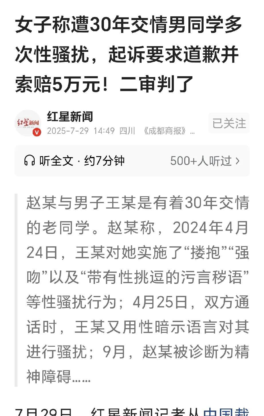 呼和浩特,一女子受邀到男同学租的房子,俩人有着30年同学情谊,万万没有想到,男同学对她又搂又抱,还亲她一口,嘴里不干不净: 我要把你办了!女子怒骂: 你不干人事,伸手伸嘴想占便宜!女子走后,男同学继续纠缠,搔 扰她32次,女子连骂带怼,拒绝他23次,事后,女子越想越气,拿着医院证明,将男同学告到法院: 我精神有了障碍,都是拜他所赐,必须给我道歉,还要赔我50000元精神损失费,案件经过一审二审,法院这样判了! 2025年7月29日,据红星新闻报道,一女子遭到男同学 姓 掻 扰,一气之下,告到了法院。 2024年4月23日,赵女士去郑州游玩,她突然发现,男同学王某也在郑州,他们之间,有30年的同学情谊。 赵女士心想,一定要和他好好聊聊,俩人约好,在某景区见面。 到了之后,俩人见面,不由的心生感慨,在景区里漫步游玩,乘兴而来,玩的十分愉悦。 到了晚饭时间,俩人吃饱之后,赵某询问,哪家的酒店比较划算? 王某热情: 在外面住干嘛,我租的房子,面积很大,你可以住到我家,还能省了酒店的钱。 赵女士摇了摇头,那咋能行,我们虽然是多年的同学,可是毕竟男女有别。 可是,架不住王某热烈邀请,赵女士决定,先去看看。 到了王某的出租屋里,环境不错,赵女士奔波了一天,她洗漱完毕,在一间卧室里沉沉睡去。 一夜无事,睡的十分安稳,第二天醒来,赵女士心生歉意,看来是自己多想,以小人之心度君子之腹。 谁知她刚收拾停当,王某就走了过来,赵女士没有防备,被王某一把抱住。 王某又搂又抱,赵某躲闪,还是被他强吻一下。 王某胡言乱语: 我要把你给办了…… 赵女士气的摔门而去,没想到王某竟然如此不尊重她! 王某赶忙给她发送了消息: 冒犯了对不起,你心里不舒服一定要骂我! 赵某没了游玩兴致,很快就回到了自己家里,她回忆起那天的事情,心里的气愤久久不能褪去。 4月27日这天,赵女士给王某发去消息: 我是住不起酒店,还是怎么着啦?我是因为咱们老同学,我接受你的这份好意! 结果这份好意,接受的代价太大,又伸手,又伸嘴的占我便宜! 我到现在都非常不爽,我都后悔我接受你这份好意! 王某随即回复: 我那天也道歉了。 可是,赵某心里越想越气,自己就是出去旅了个游,竟然被男同学给占了便宜! 5月2日这天,她一气之下,就给王某发了个视频。 王某看到之后,心里烦了,质问赵女士说: 这事儿是过不去了吗? 赵女士心生怨气: 说你不尊重女性都太轻了,根本就不是人干的事儿! 王某不再回答,你说啥就是啥吧,我说不过你,我不理你就是。 之后,赵女士又多次给王某发送信息,王某避之不及,不再言语。 赵女士看王某不理,也不回应,也不表示,没有任何道歉的意思。 于是,这件事窝到了心里,成了心病,想起来就心里膈应。 时间一晃,转眼几个月过去,赵女士神情恍惚,总像喉咙里像吞了只苍蝇。 她吐不出来,咽不下去,索性跑到医院检查,看自己到底是怎么回事。 医生下了诊断,赵女士是精神障碍,医生建议,要她尽早做系统治疗。 赵女士认为,自己的精神出现了障碍,全拜王某的行为所致。 她一纸诉状告到法院,要求王某写保证书,保证他以后再也不会搔 扰自己。 同时,她提出要求,要王某赔偿50000元精神损害费,并给她道歉。 一审判决,从王某和赵女士之间的聊天记录和通话内容来看,王某做出的行为和语言,侵犯了赵女士的人格尊严。 因此,一审法院判决,王某向赵女士赔偿5000元。 赵女士不服,怎么能少了个0?这样判决,不疼不庠,王某没有付出代价。 因此,赵女士继续上诉,王某也不满意,他不想赔,案件到了二审环节。 王某辩称,自己并没有搔 扰赵女士,是赵女士嫌自己没给她定高档酒店,也没给她购买景点门票,因此对自己心生不满。 并且,自己未曾违背她的意愿,反而是她多次挑豆自己。 可是,二审根据现有证据,认定是王某的行为对赵女士产生了一部分的精神损害,应该承担赔偿责任。 《民法典》第1010条规定: 违背他人意愿,以言语、文字、图像、肢体行为等方式对他人实施姓s扰的,受害人有权依法请求行为人承担民事责任。 在本案中,王某对赵女士实施了搂抱、强 吻等肢体行为,还使用带有挑豆的言语,违背了赵女士的意愿。 王某的行为侵犯了赵女士的人格尊严,应承担相应赔偿责任。 《民法典》第1183条第1款规: 侵害自然人人身权益造成严重精 神损害的,被侵权人有权请求损害赔偿。 王某的行为给赵女士造成了精神障 碍,经医院诊断需要系统治疗,这表明该行为已对赵女士造成了严重精神损害,赵女士有权要求王某赔偿精神损害抚慰金。 6月19日,二审判决,王某应向赵女士赔偿20000元。 对此,你怎么看?欢迎评论区留言讨论。 关注@王哥说法看百家故事,学法律知识。#头号创作者激励计划#