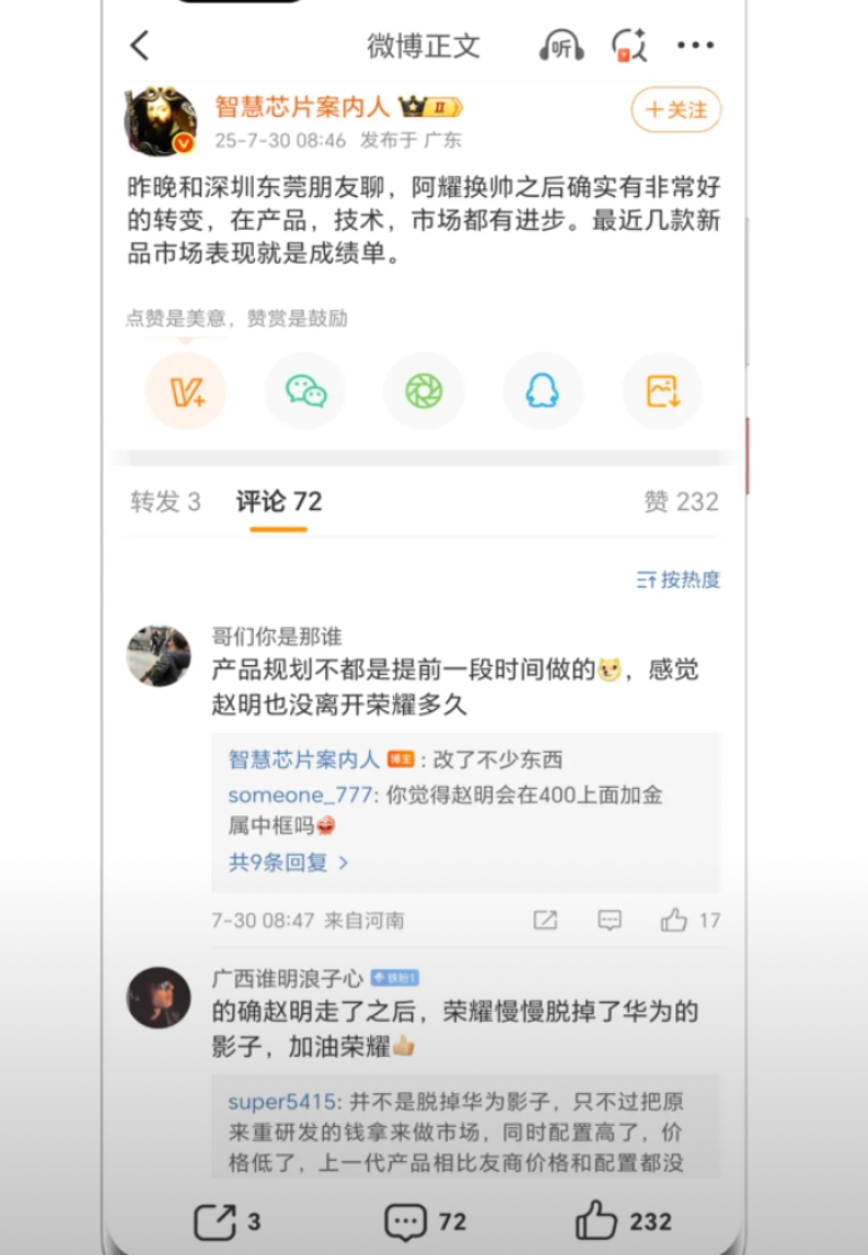 荣耀内部人自爆换帅后更好了! 最明显的就是在产品上开始有亮点了。 今年发布的多款