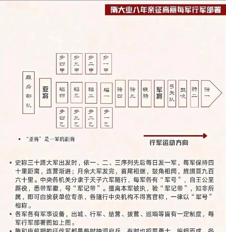 隋炀帝亲征高丽时的行军序列与军事部署 隋炀帝亲征之时,“四方兵皆集涿郡”,兵力达113.38万人,号称200万,而后勤人员更是兵力的两倍,这是一场多达300万人参与的大规模征伐。 在出征之前,他做了诸多准备工作。他开凿运河以通漕运,在汲郡建造临朔宫作为指挥所,并且还在东莱郡制造了300艘大海船。从行军序列来看,陆路有100多万大军相继跟进,队伍绵延千里而不绝;水师则由大将军来护儿率领4万人从海路向平壤进击。 隋炀帝倾尽举国之力进行征讨,却未能攻克。出征之前就存在物资和国内承受能力这两大难题。如此众多人马的物资供应是个极大的麻烦,国内也因为巨大的消耗而矛盾逐渐显现。三次征伐均无成果,这也成为隋朝“二世而亡”的主要原因。