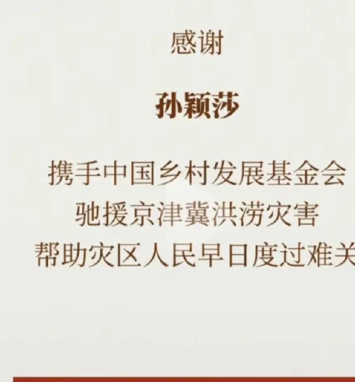 孙颖莎“乒超联赛”提前离场,原来她干了一件大事! 最近京津冀洪涝灾害严重,孙颖莎携手“中国乡村发展基金会”支持京津冀救灾物资,包括夏凉被、面包、 应急厢……各种各样的救援物资! 救援物资车也是浩浩荡荡的连成一片,这是爱的传递啊! “中国乡村发展基金会”发文:感谢,孙颖莎,对灾情的持续关注,感谢捐赠的这么多的物资,帮助京津冀迅速度过难关! 孙颖莎,真的是太好了 ! 多好的孩子,真的是泪目了,那是她一拍一拍打出来的,高低肩,小退於青,自己的奢侈品就是一次次的捐款! 自己穿着赞助商的衣服,把爱确奉献给不认识的人! 在祖国最需要的时候第一时间伸出援手,捐款捐物,场上为国争光,场下爱的温暖传递! 孙颖莎,太棒了,满满的正能量,一切的美好你值得拥有!