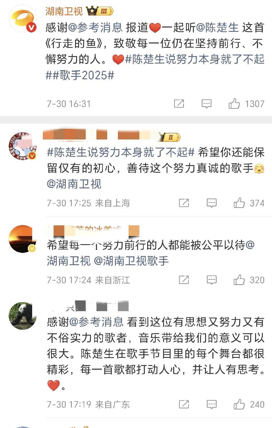 又一个官方大媒对陈楚生发出肯定,湖南卫视看到了吧!谁在带给你正能量? 《参考消息》首次表达了对陈楚生的肯定,官博转发了陈楚生《行走的鱼》,无论过去和未来,无论结果如何,努力本身就很了不起!甚至在正文里都没有提到《歌手2025》!但是节目组还是第一时间就来了评论区[笑哭]! 陈楚生在这一季歌手里,有好多官方媒体转发支持,更不用说上千家的文旅部门了,这在歌手史来还是前所未有的现象,各个层面的超级联动! 从首场的《将进酒》到《行走的鱼》,一期一个故事,勇于改变和挑战,最具歌手初心的表现,难道这些不值得这届的歌王吗?#陈楚生# #歌手2025#