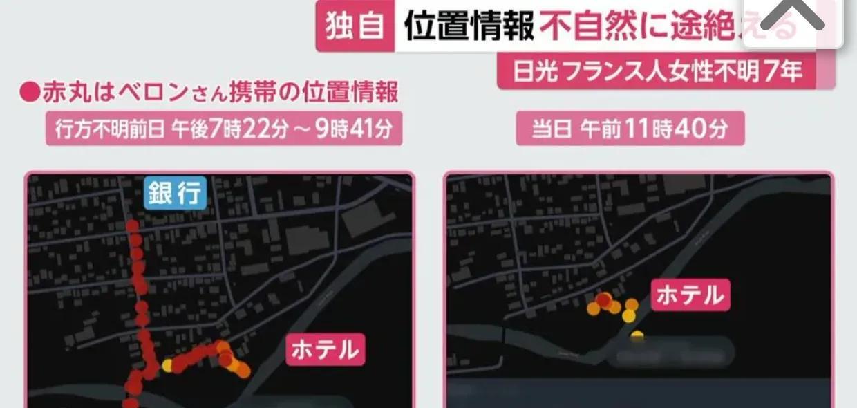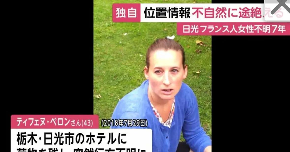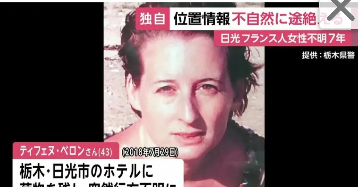 法国女子日本失踪7年至今杳无音讯 七年前的2018年7月29日,法国女子蒂芬·贝隆(43岁)在她下榻的日光市酒店内,突然失踪。贝隆的手机尚未找到。 其家人委托瑞士一家专业公司的查询,贝隆手机的详细位置信息,直到她失踪前还有。有目击事件显示贝隆于29日上午10点离开酒店,位置信息在29日上午11点40分突然被切断。 调查的瑞士 Hestia.ai 公司称:“前一天贝隆去银行时,位置信号有显示,但当她当日离开酒店后位置信号突然消失。 根据位置信息突然断开的方式,被怀疑手机是以某种非正常方式毁坏的,例如被淹没入水中或被火车碾过。 定位信号被切断得太突然,这不是正常的断电方式。 联合国强迫失踪问题委员会迄今已五次以可能的“突发事件”为由,要求日本政府向法国当局提供调查信息。
