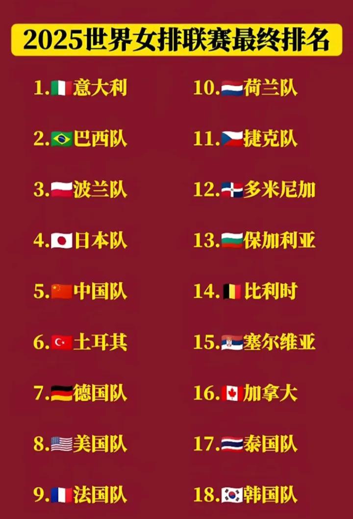 2025世界女排联赛最终排名,中国青春风暴表现不错,希望新老交替完成,再创辉煌。