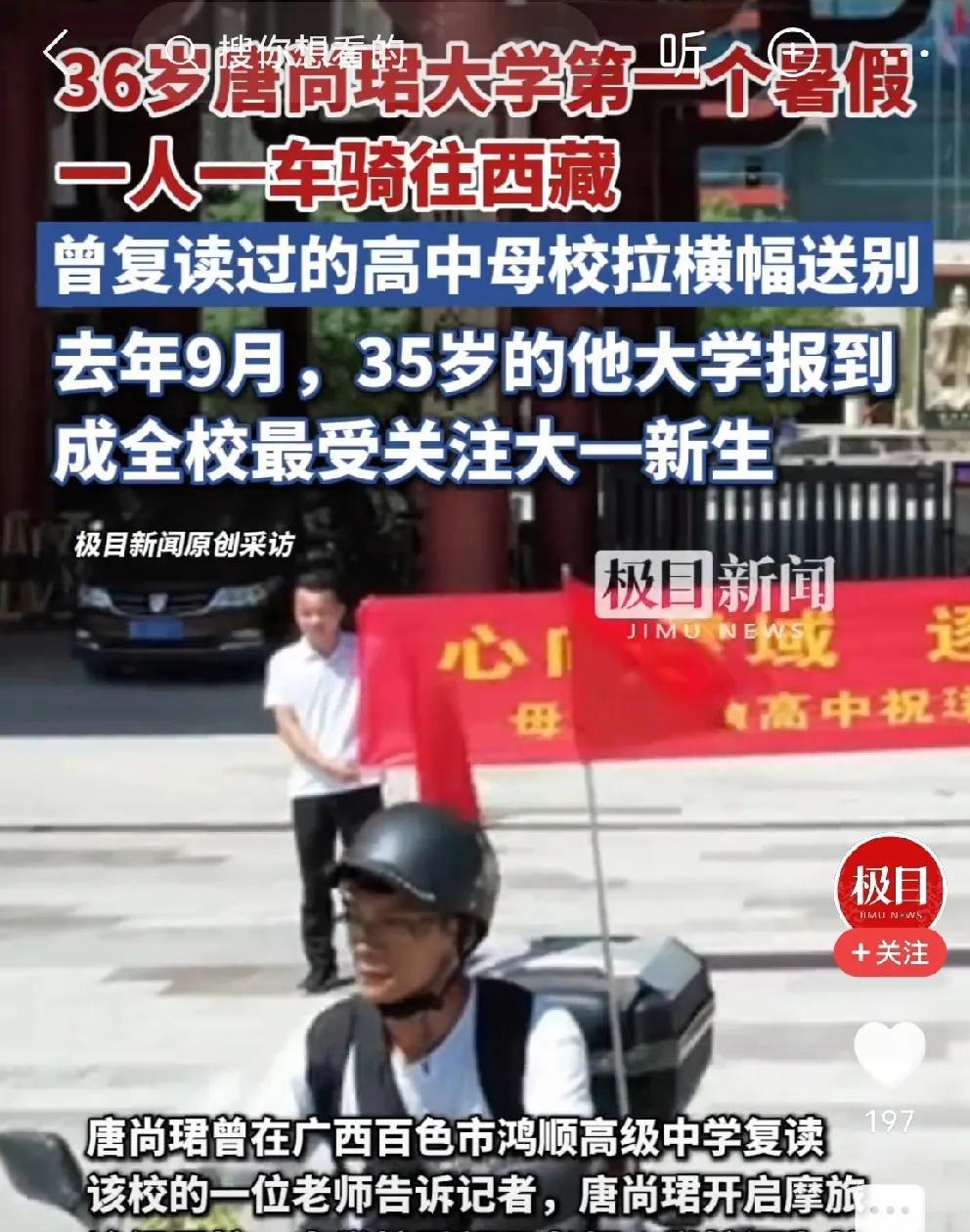 #高考16次上大学后唐尚珺骑往西藏# 唐尚珺上大学的第一个暑假,骑着二手摩托前往西藏,开启一人一车的旅行。 唐尚珺,高考16年,去年终于上岸,走进大学校门。 今年,是唐尚珺上大学的第一个暑假。对他来说,十六年的高考经历,就是一个读书人漫长的人生苦旅。 现在,终于可以放松放松了,不用面对复读的艰难抉择,不要熬更守夜的刷题… 唐尚珺朋友说:在他的心中“一直有一个漂泊流浪的梦,终于实现了”,很为他感到高兴。 唐尚珺,这个“高考钉子户”,一个寒门学子,整个青春时代,都在通往高考的路上奋斗拼搏。不容易! 祝福他,旅途愉快,一路平安,饱览祖国壮美河山,实现漂泊流浪的人生梦想[祈祷][赞][给力]