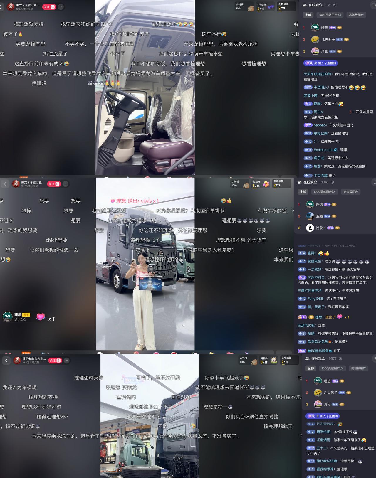 理想把乘龙卡车直播间带火了 现在已经1万人在线观看了 可以说是泼天的流量了,对卡