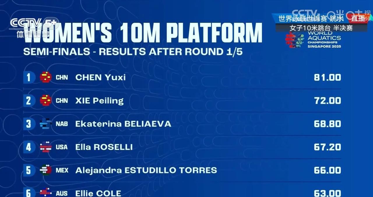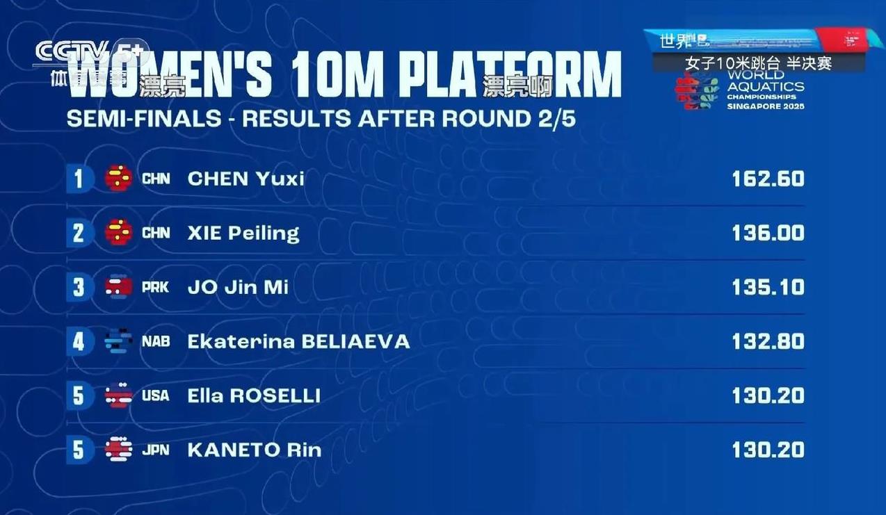 陈芋汐半决赛跳完三轮, 总分就跳出243.45 比谢佩玲高出35.45分。 还是