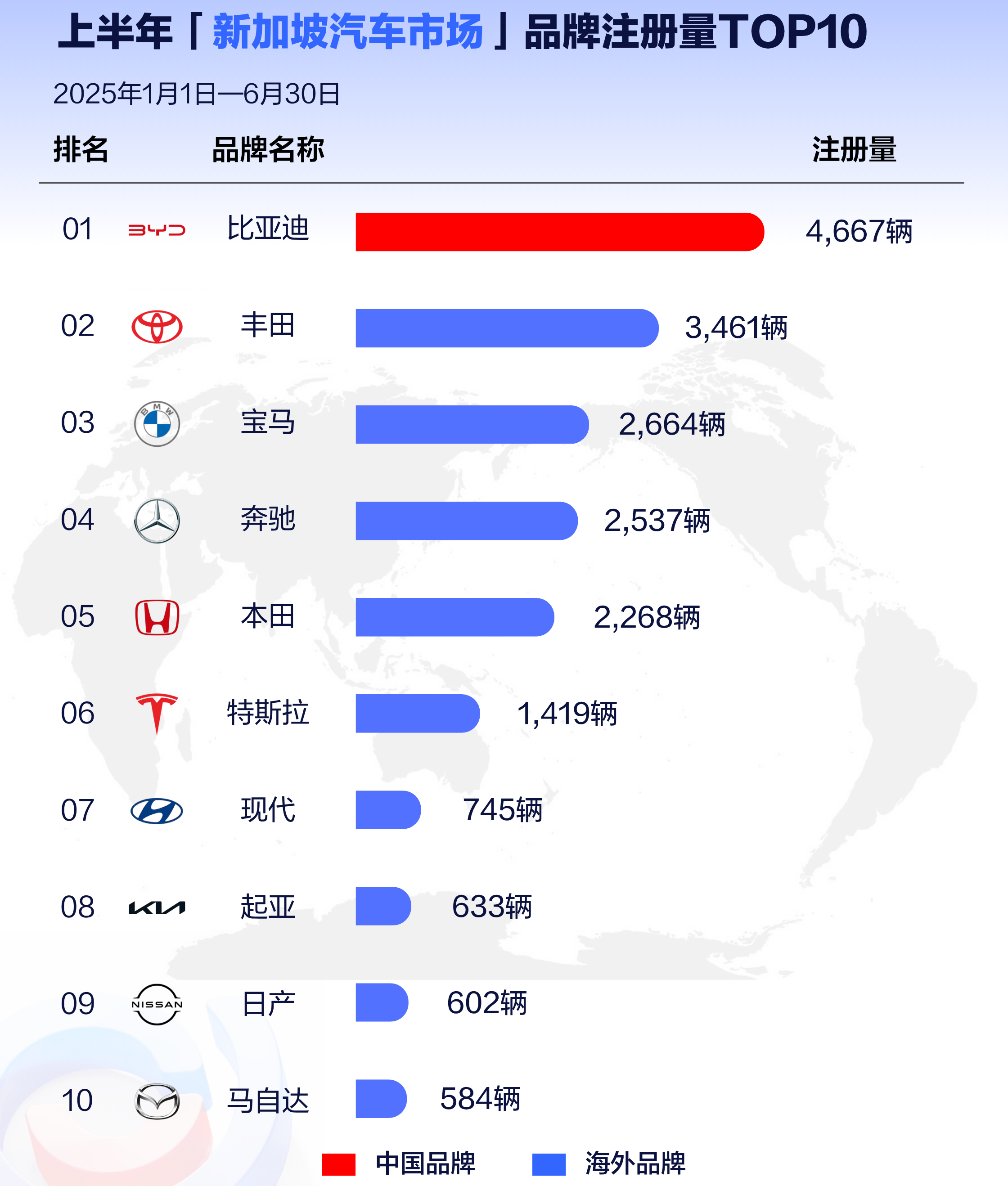 做个大胆的预测,要不了多久中国新能源汽车就将席卷全球!原因是比亚迪在海外的扩张速度太快了。 今年上半年,在新能源领域,比亚迪销量领跑全球市场,累计卖出了214.6万辆,其中海外市场销量超47万辆,半年出口量已经超过了2024年全年。 不止是出口多,比亚迪的出口含金量也是十足。比如在汽车工业发达的欧洲市场,比亚迪在西班牙的销量破万,市场占有率达到9.7%;在意大利,比亚迪上半年注册量超过9000台,环比增长140%,市场占有率突破10%。 在美洲市场,继2024年在巴西卖了7.6万辆之后,今年上半年又卖出了4.7万辆,是第二至第十名之和的两倍多。 在长期被日系车盘踞的亚太市场,比亚迪同样不遑多让,它是泰国新能源汽车和纯电动车的销冠;是新加坡的全品牌销冠;上半年,在咱们香港,比亚迪销量已经接近5000台,增速远超其他车企品牌,同时它还进入到了高度封闭的韩国汽车市场。 如今的比亚迪,已经在某种程度上用自研的DM混动、刀片电池等技术改变了中国汽车在老外们心中"廉价低质"的刻板印象,销量便是最好的证明。所以,如果说在全球范围内哪家车企最能代表咱们自主品牌,目前来看,我愿意把票投给比亚迪。对此,你怎么看?