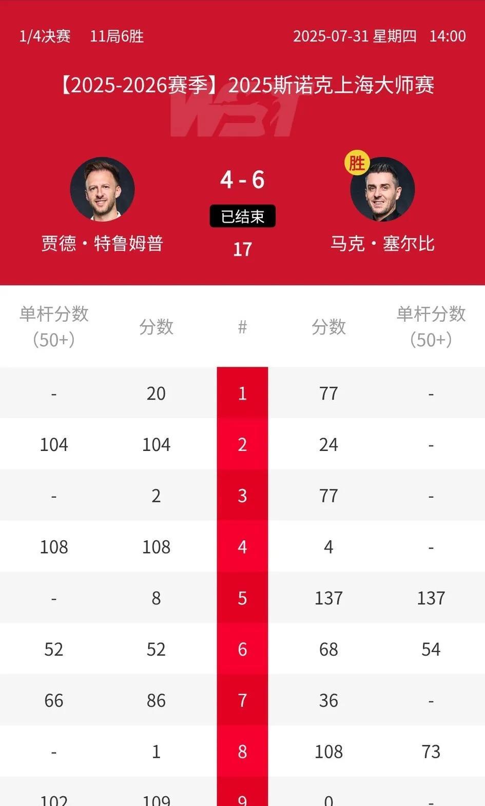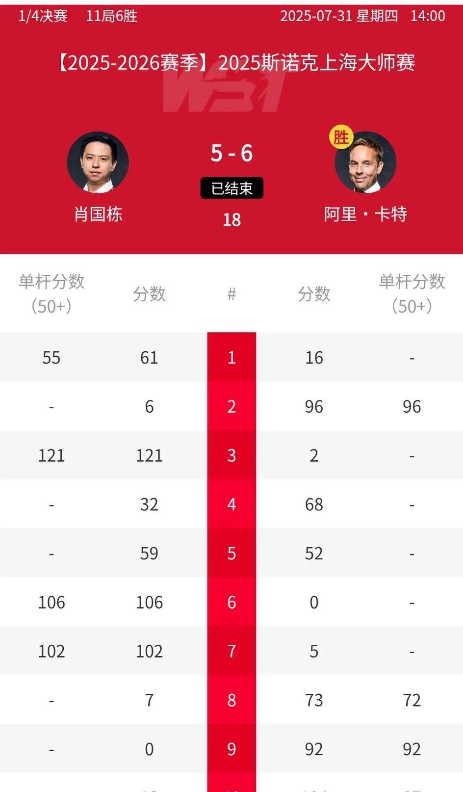 肖主播忘记自己要养家糊口,决胜局至少浪费5个上手机会,最终被卡特6-5绝杀!世界第一遭塞大师淘汰! 卡特延续昨天的剧本从2-5落后,4连鞭大逆转肖国栋,晋级半决赛。如果不是艾伦退赛,卡特哪里有这赚钱机会。 塞尔比6-4特鲁姆普,很明显小特状态极差。虽然小特打出三杆过百,但抓住机会的能力确实不如塞大师。