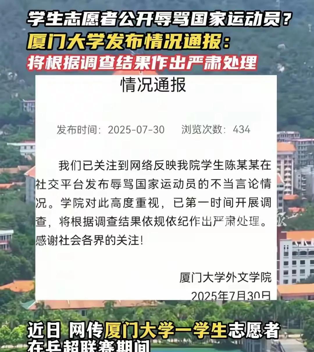7月31日厦门大学生辱骂国家运动员王楚钦和孙颖莎,还是一个大学生说话怎么如此粗俗,我感觉文化低的初中生也不至于这样说别人。你本来就是乒超的志愿者不喜欢可以不去,为什么志愿者乒超结束还要在朋友圈骂人。 现在学校也是开展调查,不知道会不会影响去学校上学。身为一个学生还是学点好的东西,运动员为国争光你不能这样诋毁别人。不喜欢你可以不去做志愿者没人逼你,既然去了就应该完美完成工作,该回家回家该打工打工,运动员都很辛苦的训练你天天应该看见了。你这样说运动员你行你上,不行就不要说别人。