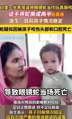 “太厉害了!”印度一名1岁男孩在家里玩耍时,不小心把一条眼镜蛇当成玩具,竟然用牙