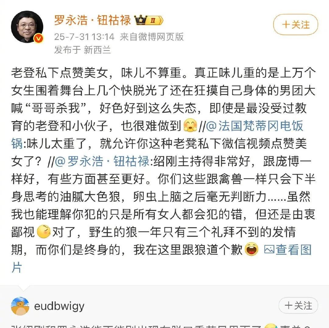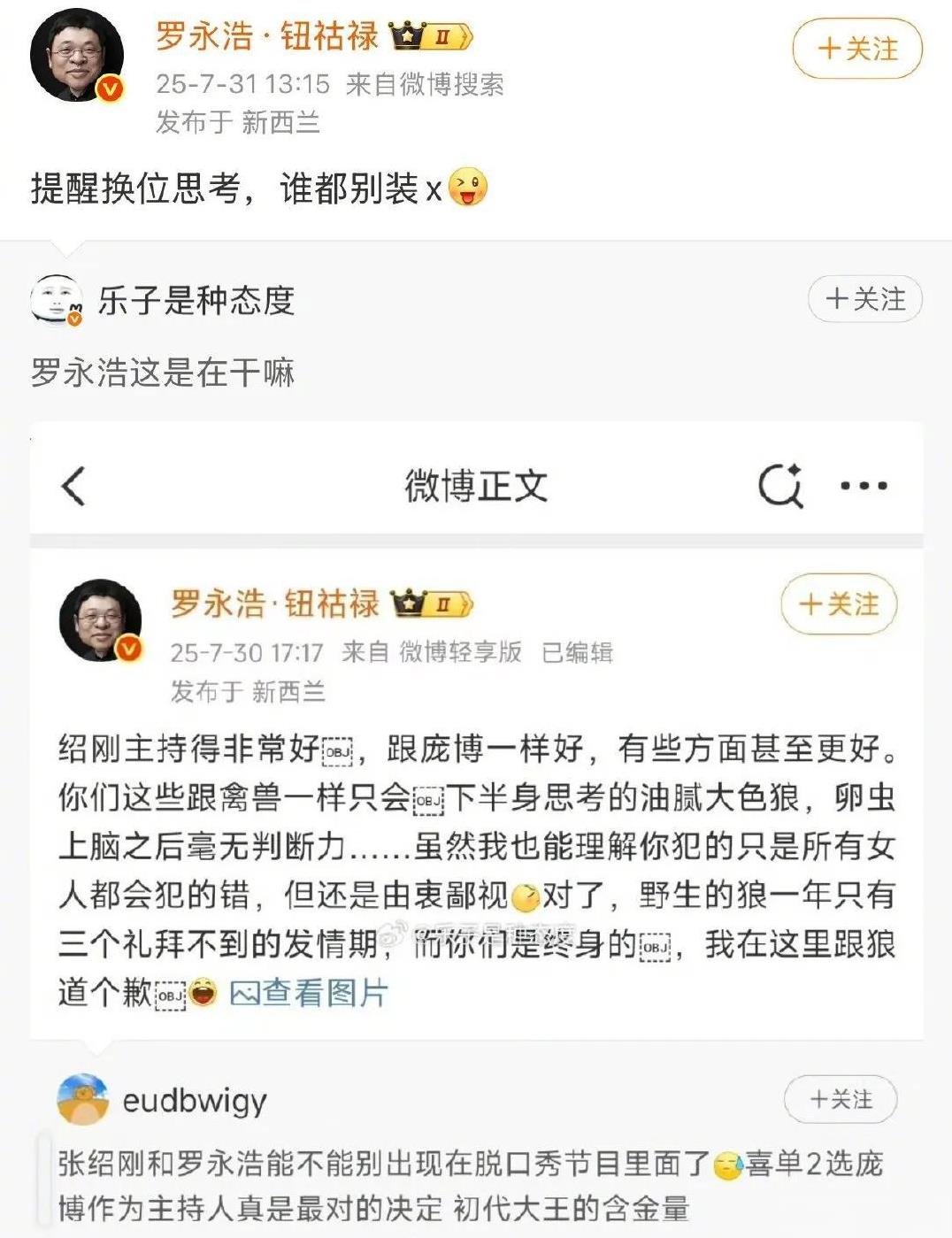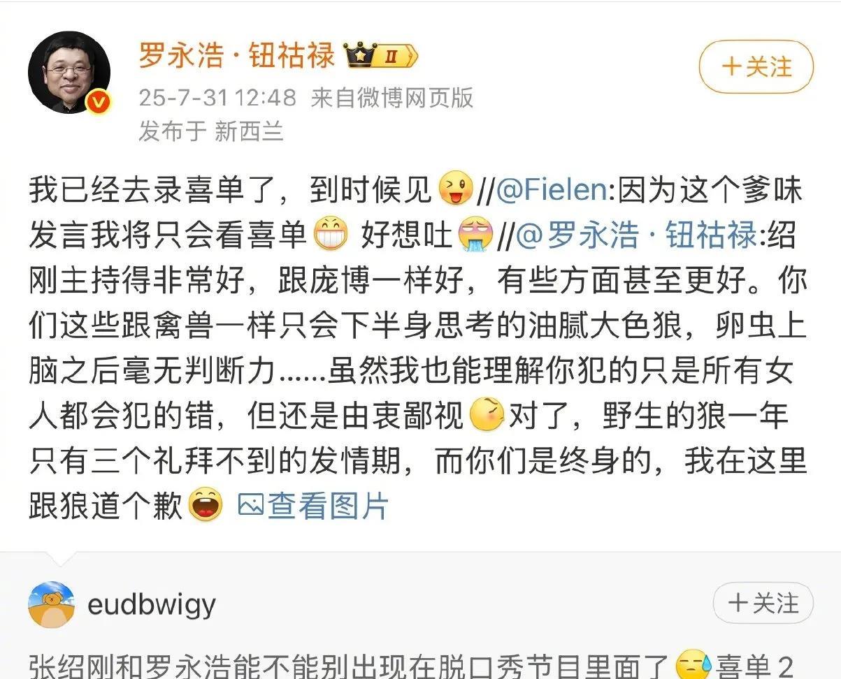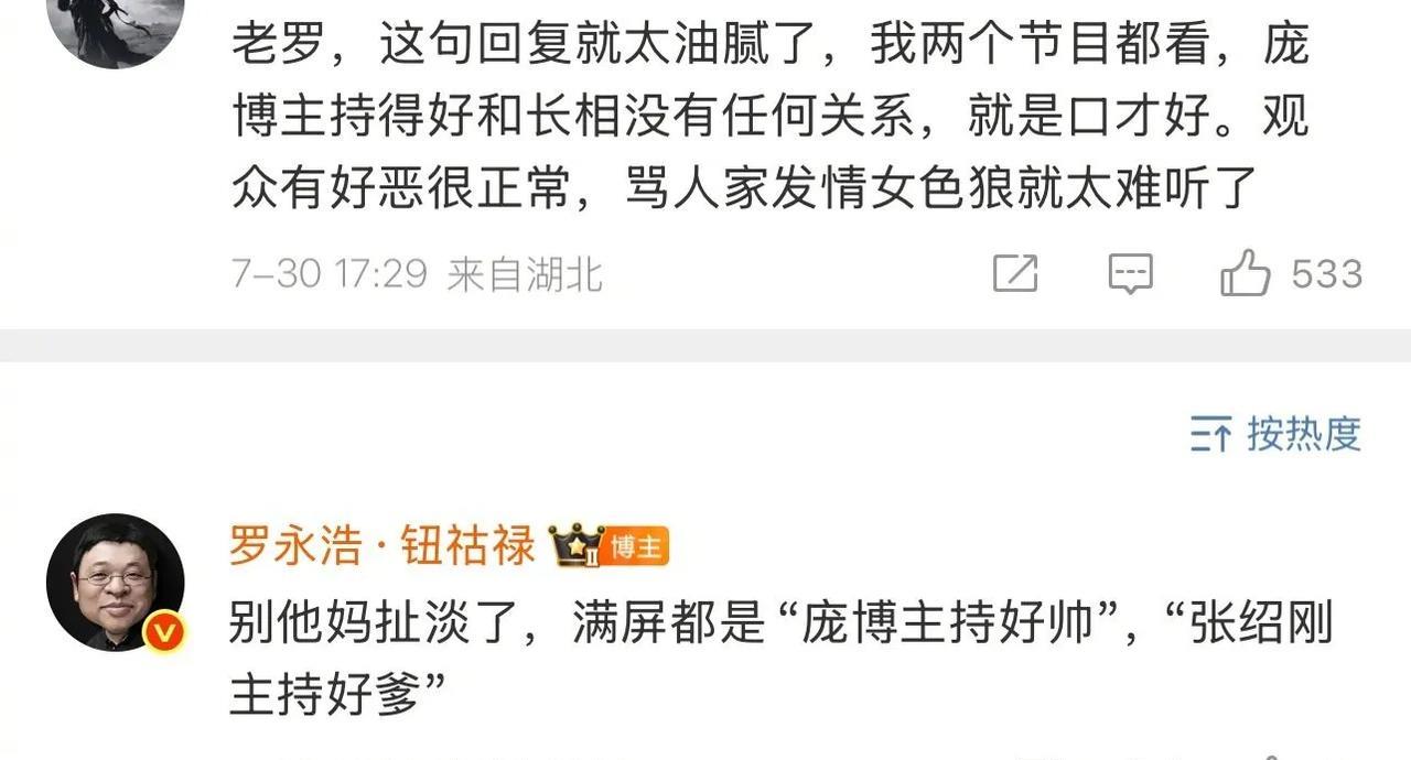 罗永浩力挺张绍刚,网络辩论战火重燃 近日,脱口秀界又掀起了一场舆论风暴,而这次的主角是罗永浩与张绍刚。事情的起因是一位网友在社交平台发文吐槽:“张绍刚和罗永浩能不能别出现在脱口秀节目里面了,喜单2选庞博作为主持人真是最对的决定,初代大王的含金量。”此言论一出,迅速引发众多网友关注,而罗永浩也很快注意到了这条动态,并亲自下场回应,力挺张绍刚。 罗永浩毫不客气地回击道:“绍刚主持得非常好,跟庞博一样好,有些方面甚至更好。你们这些跟禽兽一样只会下半身思考的油腻大色狼,卵虫上脑后毫无判断力……虽然我也能理解你犯的只是所有女人都会犯的错,但还是由衷鄙视 。”这番言辞犀利的回复瞬间点燃了网友们讨论的热情,“罗永浩力挺张绍刚”的话题也顺势登上热搜。 张绍刚作为脱口秀节目的常客,其主持风格一直以来都颇具争议。有人欣赏他的幽默和控场能力,认为他能在关键时刻调节气氛,推动节目顺利进行;也有人觉得他主持时风格过于老套,甚至有些“爹味”。在这次事件中,支持罗永浩观点的网友认为,他敢于为朋友发声,不畏惧网络舆论压力,展现出了真性情。同时,他们也认可张绍刚在脱口秀领域的专业能力,觉得不应该被轻易否定。 然而,反对者则指责罗永浩言辞过激,认为即便想表达对张绍刚的支持,也不该用如此攻击性的语言。他们觉得罗永浩作为公众人物,言行应该更加谨慎,这样的回应不仅不能解决问题,反而会加剧矛盾。此外,还有部分网友表示,庞博和张绍刚的主持风格各有千秋,没有必要强行比较,选择谁做主持人更多是基于节目定位和受众喜好。 面对网友的质疑和反驳,罗永浩并未退缩,而是进一步阐述自己的观点。他强调,张绍刚在脱口秀主持方面有着丰富的经验和深厚的功底,对节奏的把握、对嘉宾的引导都十分出色。他认为网友们的评价过于片面,仅仅因为个人喜好就否定一位主持人的努力和才华是不公平的。 这次罗永浩与网友的大辩论,表面上看是关于张绍刚主持能力的争论,实则反映出当下网络舆论环境中,公众人物与普通网友之间复杂的关系。公众人物的一言一行都在聚光灯下,稍有不慎就可能引发轩然大波;而网友们在表达观点时,也常常带着强烈的个人情感,缺乏理性的思考和客观的判断 。 随着事件的发酵,越来越多的人加入到这场讨论中,不仅是脱口秀爱好者,还有许多关注网络生态和公众人物言行的普通网友。大家各抒己见,使得话题的热度持续攀升。这场大辩论究竟会如何收场,罗永浩和张绍刚后续又会做出怎样的回应,都让我们拭目以待 。