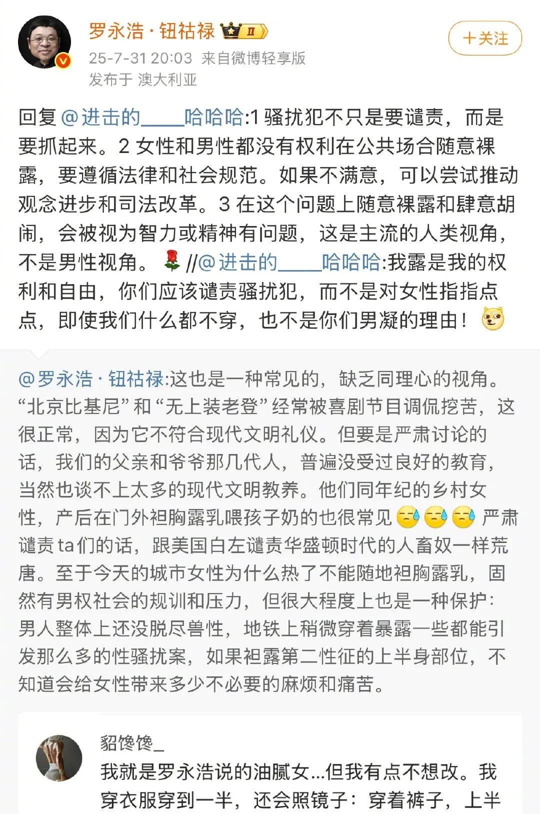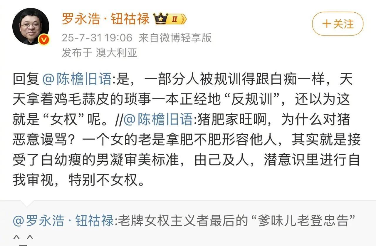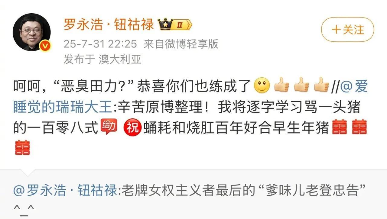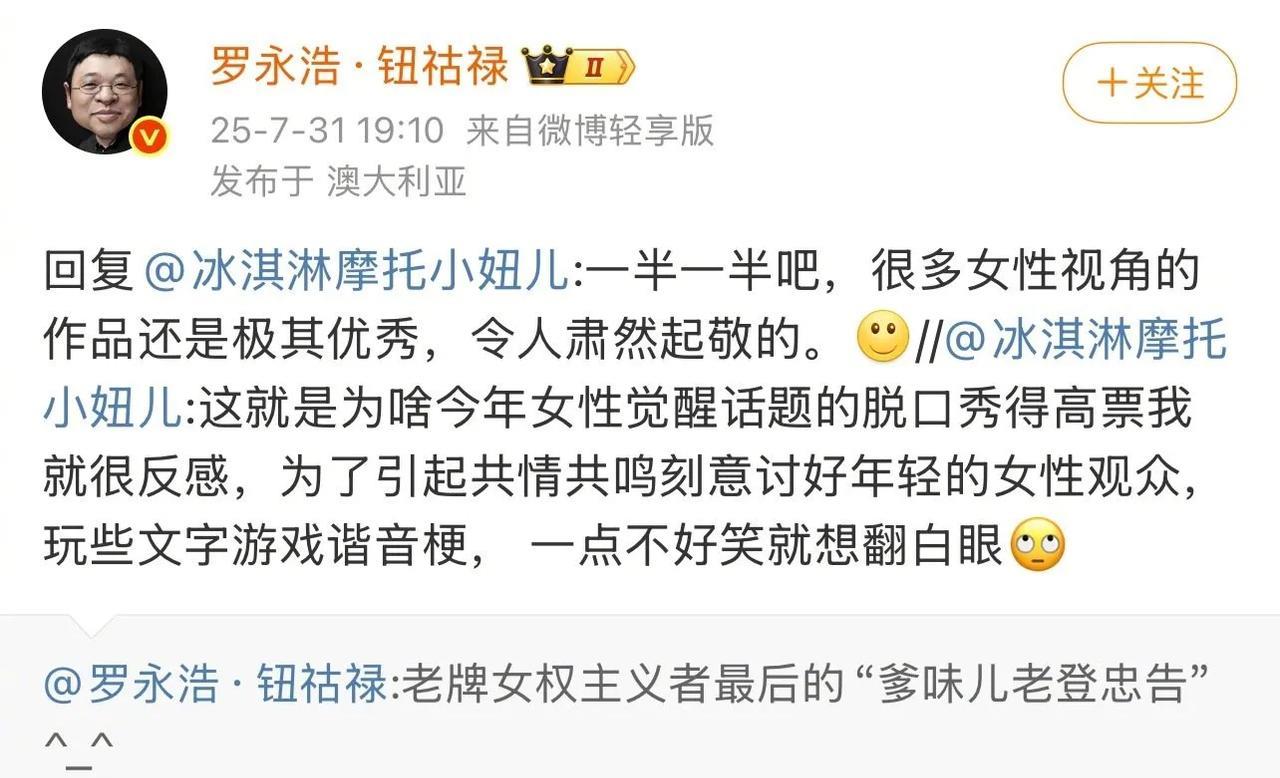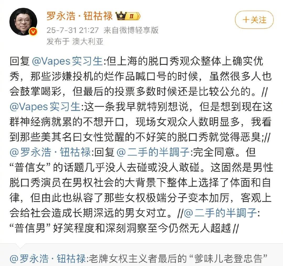 罗永浩力挺张绍刚,网络辩论战火重燃 近日,脱口秀界又掀起了一场舆论风暴,而这次的主角是罗永浩与张绍刚。事情的起因是一位网友在社交平台发文吐槽:“张绍刚和罗永浩能不能别出现在脱口秀节目里面了,喜单2选庞博作为主持人真是最对的决定,初代大王的含金量。”此言论一出,迅速引发众多网友关注,而罗永浩也很快注意到了这条动态,并亲自下场回应,力挺张绍刚。 罗永浩毫不客气地回击道:“绍刚主持得非常好,跟庞博一样好,有些方面甚至更好。你们这些跟禽兽一样只会下半身思考的油腻大色狼,卵虫上脑后毫无判断力……虽然我也能理解你犯的只是所有女人都会犯的错,但还是由衷鄙视 。”这番言辞犀利的回复瞬间点燃了网友们讨论的热情,“罗永浩力挺张绍刚”的话题也顺势登上热搜。 张绍刚作为脱口秀节目的常客,其主持风格一直以来都颇具争议。有人欣赏他的幽默和控场能力,认为他能在关键时刻调节气氛,推动节目顺利进行;也有人觉得他主持时风格过于老套,甚至有些“爹味”。在这次事件中,支持罗永浩观点的网友认为,他敢于为朋友发声,不畏惧网络舆论压力,展现出了真性情。同时,他们也认可张绍刚在脱口秀领域的专业能力,觉得不应该被轻易否定。 然而,反对者则指责罗永浩言辞过激,认为即便想表达对张绍刚的支持,也不该用如此攻击性的语言。他们觉得罗永浩作为公众人物,言行应该更加谨慎,这样的回应不仅不能解决问题,反而会加剧矛盾。此外,还有部分网友表示,庞博和张绍刚的主持风格各有千秋,没有必要强行比较,选择谁做主持人更多是基于节目定位和受众喜好。 面对网友的质疑和反驳,罗永浩并未退缩,而是进一步阐述自己的观点。他强调,张绍刚在脱口秀主持方面有着丰富的经验和深厚的功底,对节奏的把握、对嘉宾的引导都十分出色。他认为网友们的评价过于片面,仅仅因为个人喜好就否定一位主持人的努力和才华是不公平的。 这次罗永浩与网友的大辩论,表面上看是关于张绍刚主持能力的争论,实则反映出当下网络舆论环境中,公众人物与普通网友之间复杂的关系。公众人物的一言一行都在聚光灯下,稍有不慎就可能引发轩然大波;而网友们在表达观点时,也常常带着强烈的个人情感,缺乏理性的思考和客观的判断 。 随着事件的发酵,越来越多的人加入到这场讨论中,不仅是脱口秀爱好者,还有许多关注网络生态和公众人物言行的普通网友。大家各抒己见,使得话题的热度持续攀升。这场大辩论究竟会如何收场,罗永浩和张绍刚后续又会做出怎样的回应,都让我们拭目以待 。