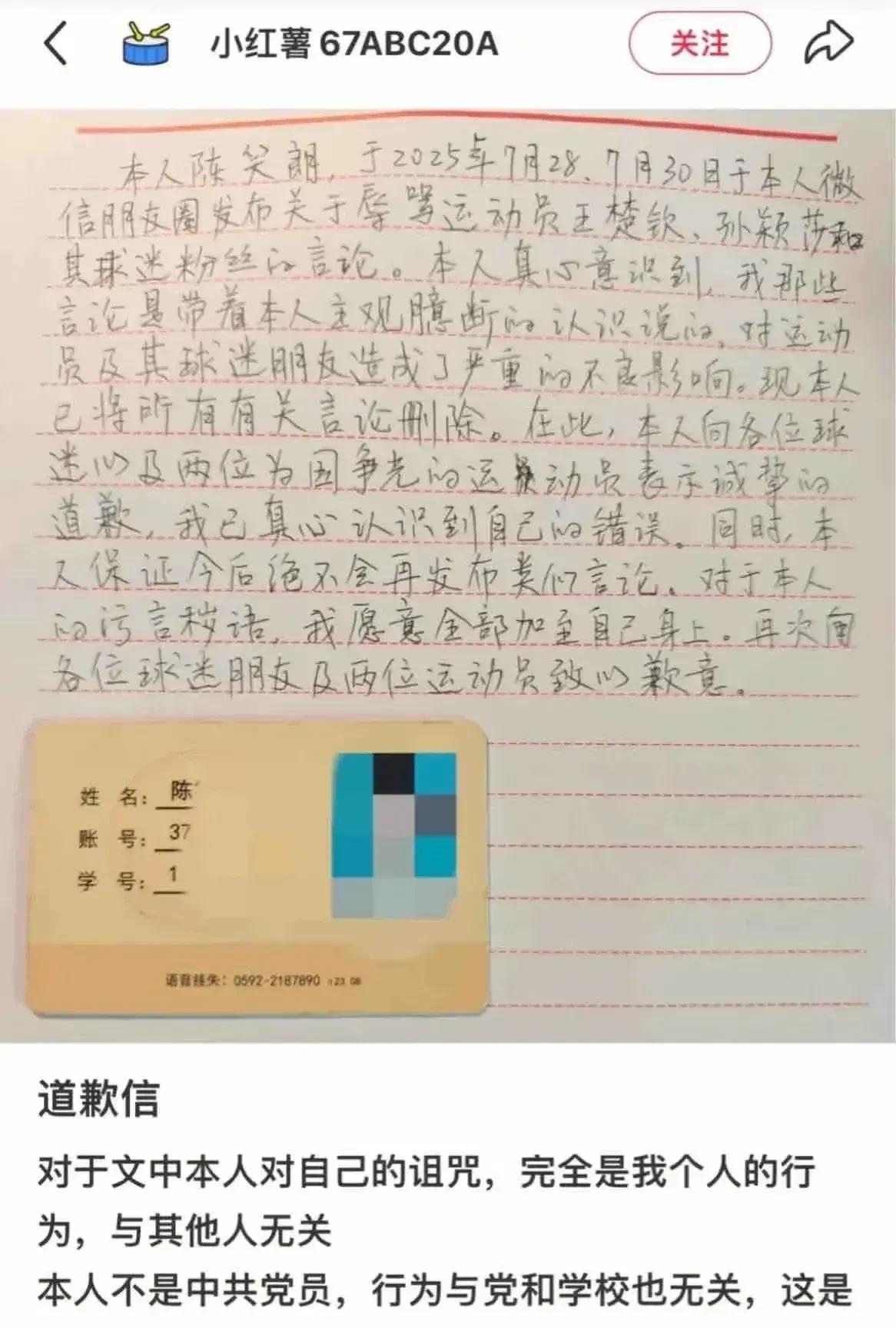 按理说能作为大学志愿者去乒超赛场素质都应该是不差啥的。你的诉求是志愿者公司欠你们的工时和工资,你找他们怎么要,怎么沟通那都不过份。但是爆粗口骂到运动员的身上,还一句接一句就是过份了。更重要的是从名字就开始谩骂直到技战术。看了他的朋友圈原文,似乎他应该是高水平运动员的大学生,要不然他不会提到去学技术。 他文件提到他是继科粉,提到爱屋及乌跟继科友好的运动员他都喜欢。所以看到他的骂人内容里提到王曼昱,林诗栋,都在他骂的范围内。当然王楚钦孙颖莎是首当其冲被骂的最惨的不共戴天的那个。这就很明显的他是什么粉了。亏了继科早就退役不在国乒队里打球了。