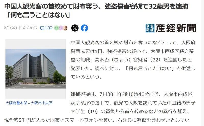 日本人抢劫中国游客被抓获 日媒《产经新闻》8月1日报道:7月30日晚上10点40分左右,在大阪市西成区萩之茶屋附近,无业嫌疑人高木杏(32岁),盯上一名来大阪观光的中国藉男大学生(19岁)并实施抢劫。 高木杏从背后勒住中国藉受害人的脖子,抢走一个装有约5000日元(约240元人民币)现金的钱包和手机,抢劫过程中中国籍大学生右肘受轻伤。 据警方称:当时中国籍大学生与朋友一起刚从便利店出来,正在返回下榻酒店的途中,嫌疑人高木杏从后面接近,突然袭击了受害人。 具体作案细节警方还在调查中。