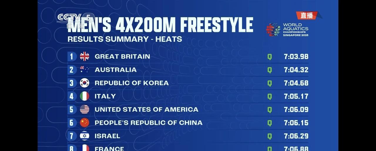 男子4×200米游泳接力, 第一棒:费立纬 1分46秒94,第5名交棒 第二棒:季新杰 1分46秒09,第3名交棒 第三棒:汪顺 1分46秒64,第2名交棒 第四棒:张展硕 1分46秒48,第2名完赛 中国队总成绩7分06秒15,以第六名的成绩进入晚上的决赛。 不出意外,晚上的决赛潘展乐应该会游最后一棒,不知道还会不会有奇迹发生,帮助中国队站上领奖台。