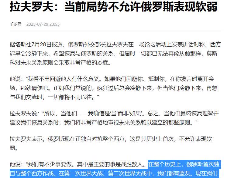 拉夫罗夫这话一出口,等于彻底捅破了窗户纸:俄罗斯已经被全球孤立到只剩自己,所谓的