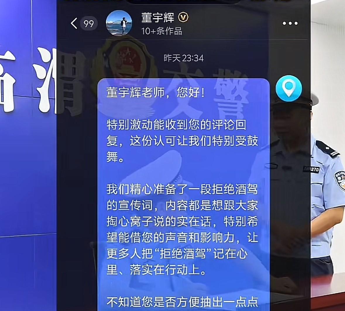 董宇辉接受家乡邀请,录制"拒绝酒驾"安全宣传片。 这个邀请方式挺特别的,渭南市临渭区交警在平台发布一视频,大概是想借董宇辉的影响力,宣传一下拒绝酒驾。 没想到得到了宇辉的回复,宇辉直接问:录个啥? 临渭交警马上私信回复了宇辉,宇辉真的正儿八经的录了一段视频,发给临渭交警,把临渭交警高兴的屁颠屁颠的。 感觉宇辉的行事风格还是与众不同的,说话办事直接痛快。 虽然身在北京,全国四处飞,但感觉和家乡渭南,就像同处在一个城市,仅是在不同房间而已。