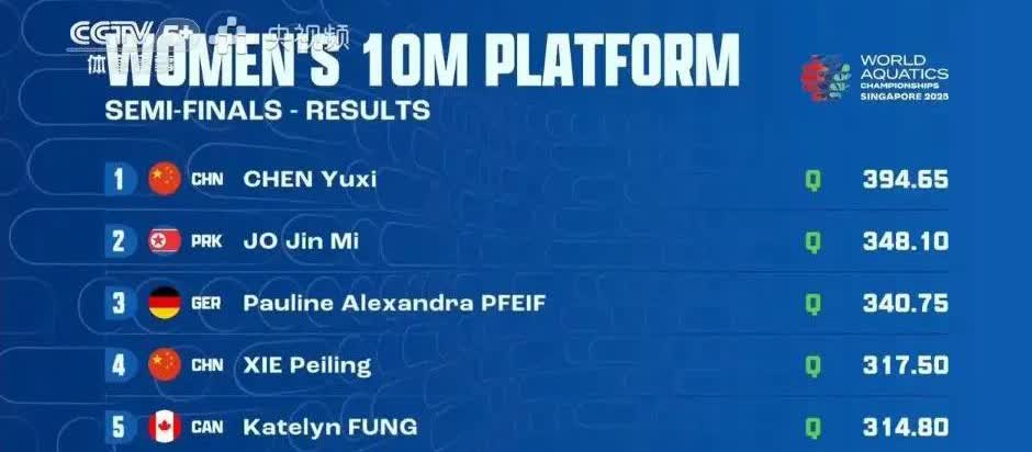 看着这个新加坡世锦赛女子10米台半决赛的排名,估计今晚陈芋汐的世锦赛“五连冠”是稳了。 大家怎么看呢?