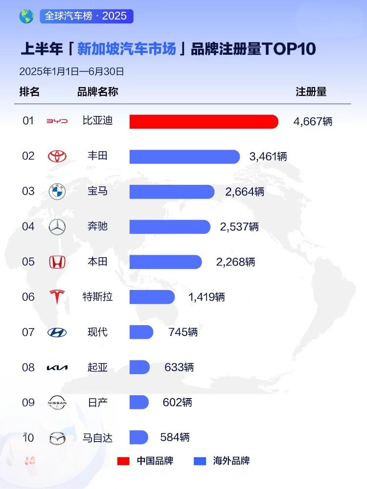 2025年上半年,比亚迪以214.6万辆的全球销量强势领跑新能源汽车市场,其中海外销量超47万辆,同比猛增132%,仅半年就超越去年全年海外总量。 比亚迪销量领跑全球市场实至名归。在欧洲“高地”,比亚迪在西班牙月销破万、增速高达756%;在意大利市占率突破10%。巴西市场,其以4.7万辆蝉联销冠,销量超第二至第十名总和。亚太地区,比亚迪在泰国纯电份额达35%,更一举拿下新加坡、香港等高端市场销冠。 从欧洲“破冰”到拉美建厂,从被质疑到获认可,比亚迪以技术深耕与坚定本土化战略,在政策与竞争的重围中闯出生路,正以中国力量重塑全球汽车产业版图。
