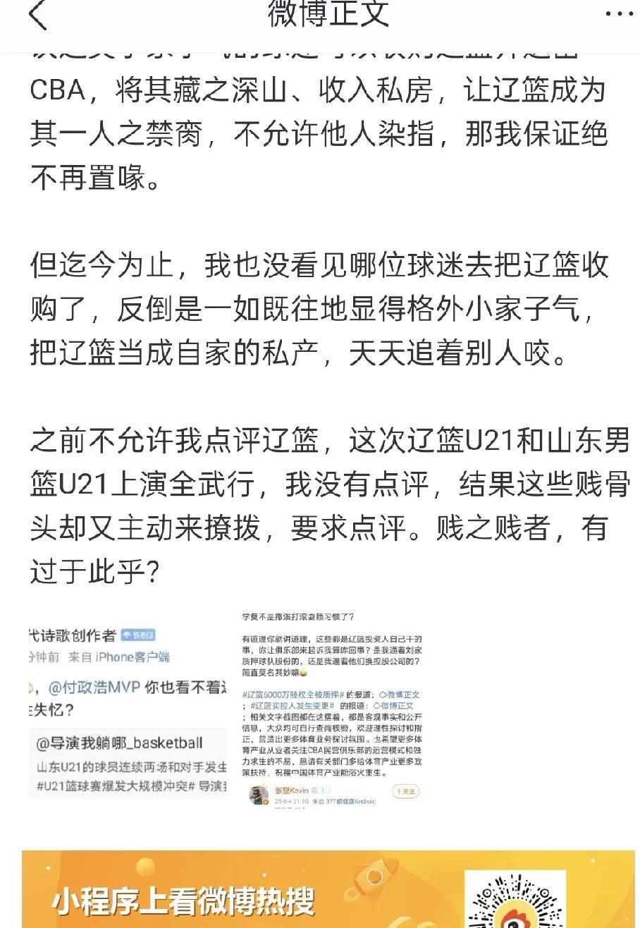 付政浩:辽宁部分球迷就是贱骨头,我之前遭到辽宁IP疯狂网暴谩骂,是因为之前他点评辽宁男篮股权质押问题,有球迷还跟他说,只要他不点评辽宁男篮,就不招惹他。 但是U21辽宁男篮和山东男篮上演全武行之后,又有辽宁男篮球迷来撩拨我,质问我为啥不报道这一丑闻。贱之贱者,有过于此乎? 为什么辽宁球迷让付政浩报道辽宁和山东打架事件,估计是辽宁球迷认为U21辽宁男篮是被打一方,是山东男篮先挑衅的,所以辽宁男篮是占理一方。所以媒体报道越多越好。 #头号创作者激励计划# #辽宁男篮#