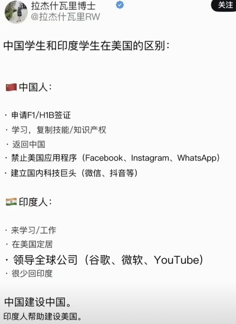印度人去了美国,几乎没几个回去,因为印度与美国的差距过大,个人是无法弥合差距的。但是咱们国人去美国,留下的很多,回来的也很多。也许是五五开的几率,印度估计一九开都不到。无论咋样,现实就是如此。