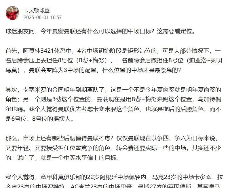 罗马诺:曼联现在打算签下一名纯防守后腰 大概意思是,曼联在夏窗初期打算拿下帕里尼亚的,只是现在帕里尼亚去了热刺,所以曼联打算拿下一个强度更大的防守后腰。 目前来看,曼联是有预算去签下中锋+后腰的,至于后腰方面,如同预估的一样,不是B费这个位置的,而是卡塞米罗这个位置的,这就是考虑到卡塞米罗明年合同到期离队进行准备的了。如果按照这个趋势的话,梅努这个角色真的有点危险,因为乌加特在上赛季就在开发8号位的技能。 我想,曼联也在做好梅努离队的准备,毕竟梅努还没有续约。