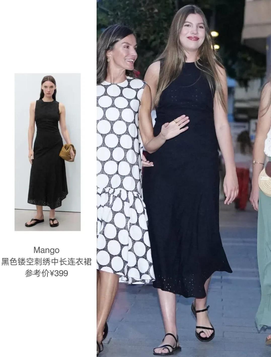 度假新照来喽~母女三人私下压马路&观影。 这次不见夏日草编坡跟鞋了,母女三人均是平底夹趾凉鞋。莱后身穿了件2020年的Carolina Herrera无袖连衣裙,单拎了来自法国品牌Antik Batik的镂空黑色手提包,搭配的美国鞋履品牌Tkees的夹趾凉鞋。 诺拉&索妹则均有再上身Mango单品——诺拉的刺绣钩花镂空上衣以及索妹的无袖款黑色镂空刺绣连衣裙。姐姐还有下搭西班牙本土品牌Rivera(索妹在姐姐海军毕业礼以及赫罗纳公主奖期间均有上身过的品牌)的休闲裤,也依旧有佩戴获赠的Tiffany Open Heart项链,所背的皮革藤编包则来自Whittelily(莱后也有两款她家单品)。
