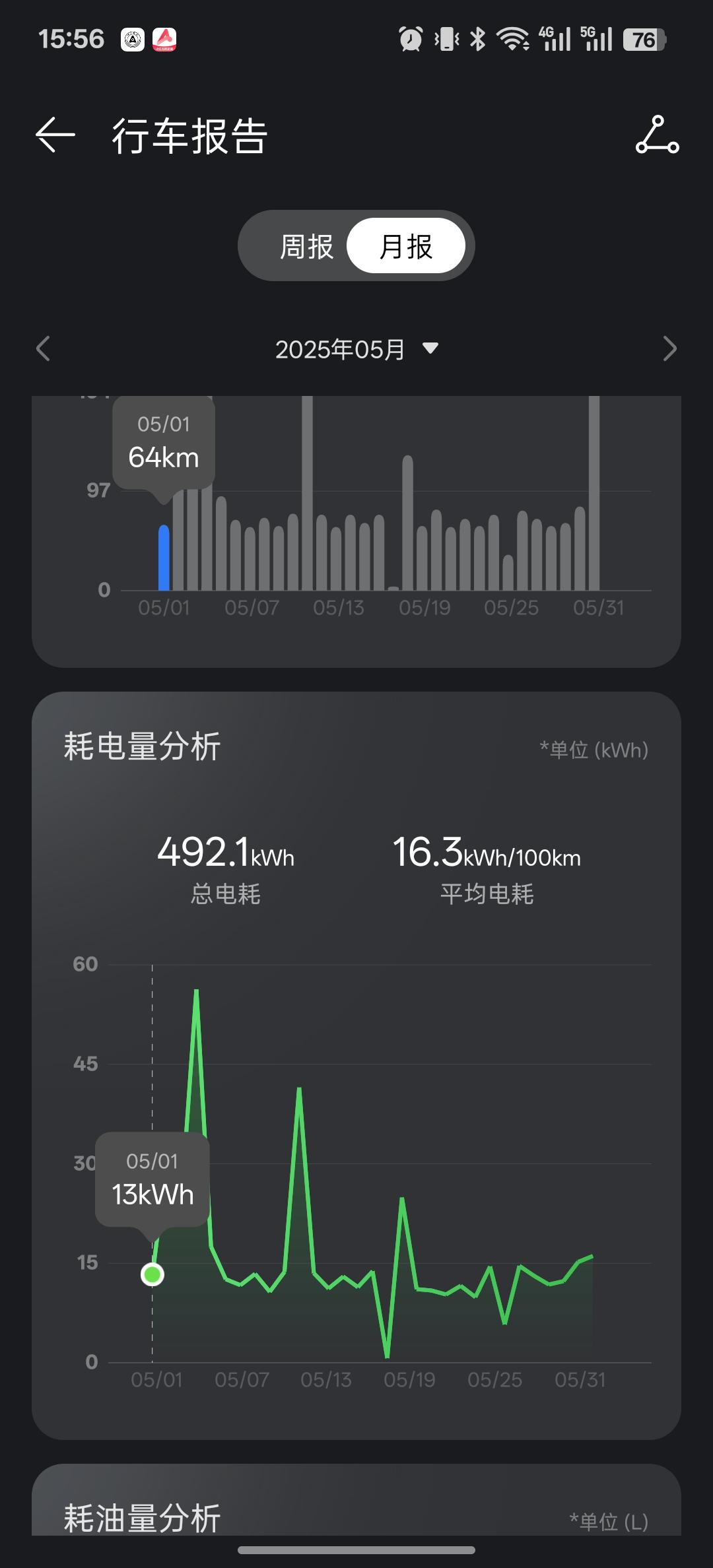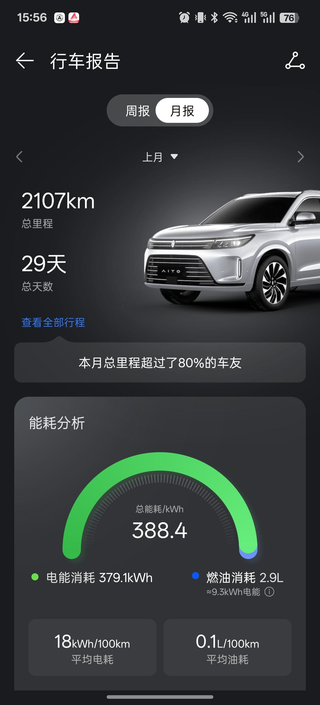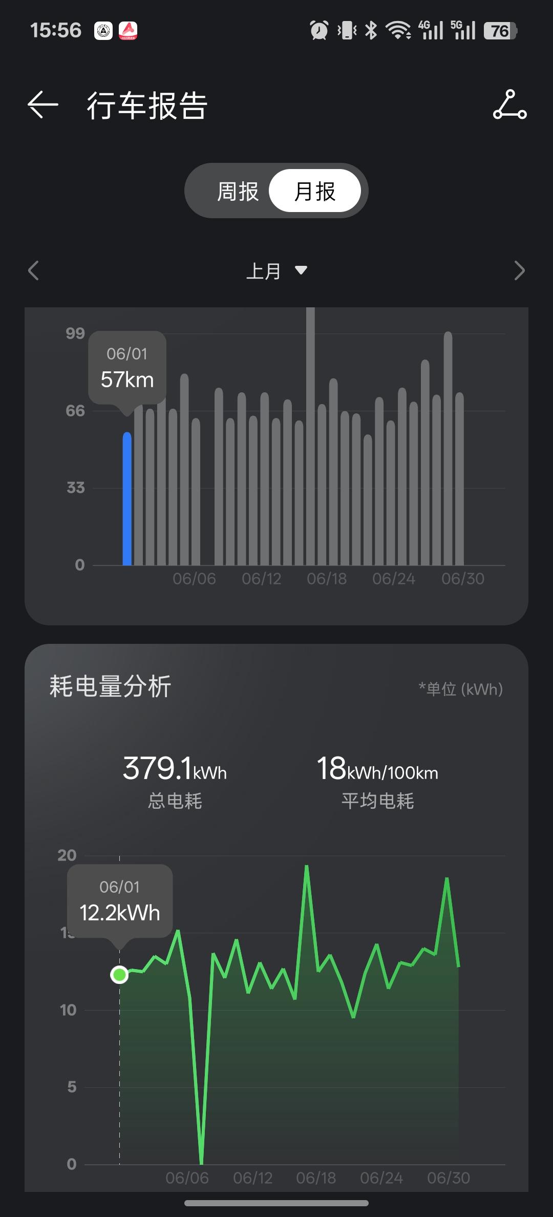 涵盖高速 高架和地面路段,每个月2000公里左右,95%里程都是纯电跑的,用来分享电耗应该没问题吧。 5月跑了3017公里,APP里显示的电耗是16.3,6月跑了2100公里,电耗是18。如果电耗真是如此的话那我都能笑出声了,但m7就是欢乐表,虚标严重。 以夏天走高架和地面道路为例,在早晚温度20度左右,不开空调,不堵车且没有急加速的情况下,我的表显电耗最低是15.5,开了空调,正常行驶的表显电耗在17.5-19之间,但自己实测下来是要在20左右的。我单程60公里,两天最多130,按理来说极限是能跑3天180公里左右再充电,但实际情况我我两天就要充一次。 每次我都是晚上充电到90%,跑两天下班到家后基本就剩10%左右的电了,根本达不到3天一冲。 冬天续航更不用看了,我冬天通勤,开暖风,表显的电耗在25左右,但实际已经快到40了,满电通勤只能跑100公里出头。 咱不说续航到底差多少,就说这个表显电耗虚标实在有点严重了,没想到问界也干这种事儿,我一度怀疑电耗是不是没把空调算进去 现在的增程车真的是有点难受的,三元锂电池又说最好在20-90%电量区间使用,但增程车合计电池就这么大点,在掐头去尾可用的电量已经很少了,除非有家充天天晚上到家就插上,但是也很烦。期待以后的固态电池加小油箱,纯电如果能实打实300公里就很棒