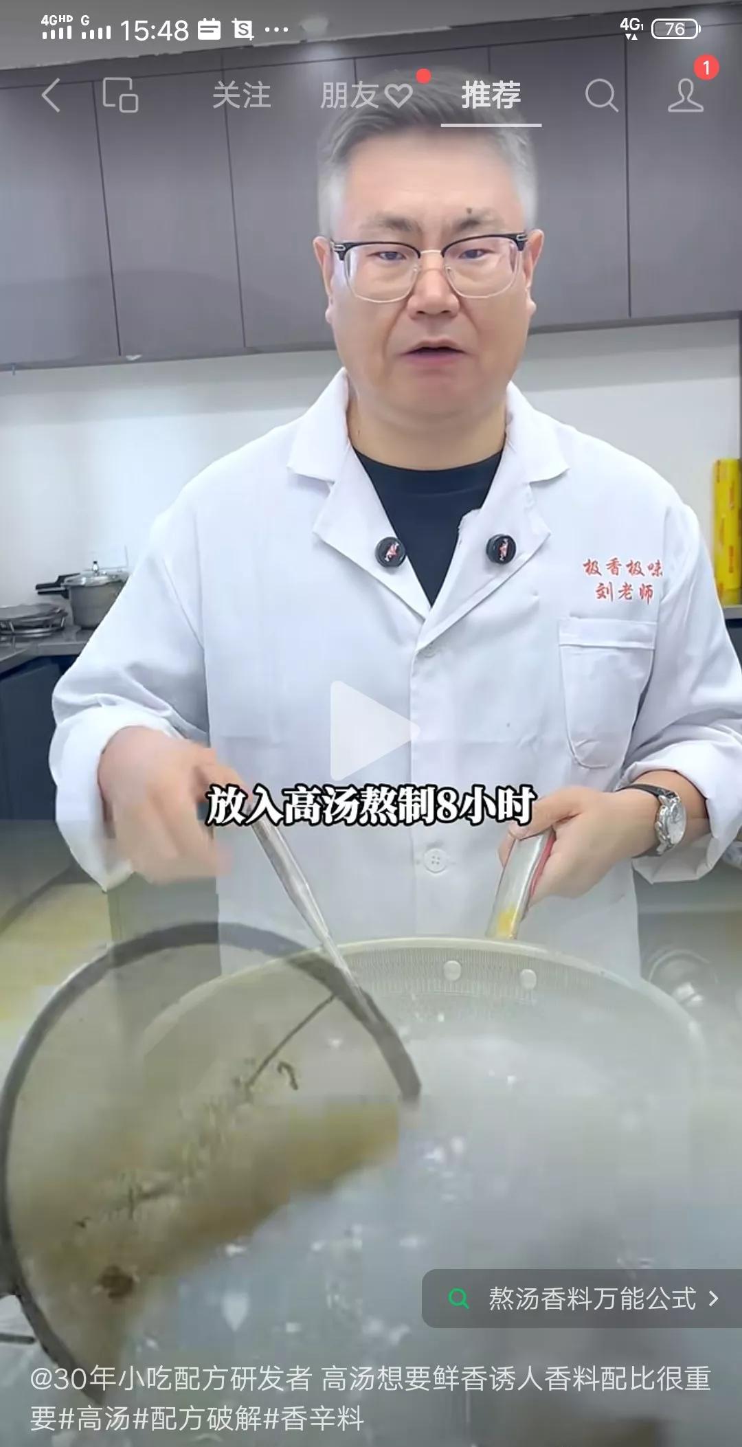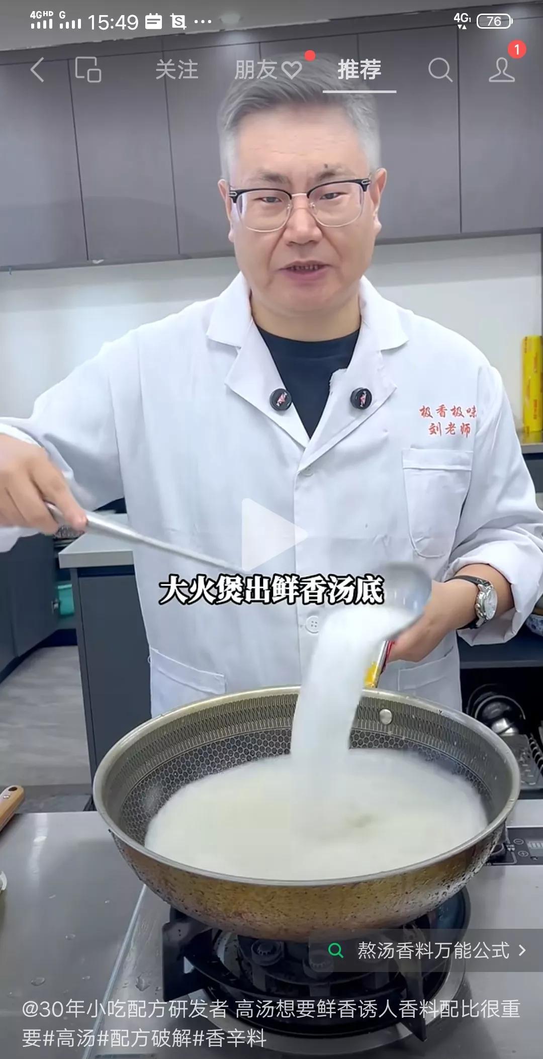 高汤香料配方 陈皮8克, 甘草6克, 香砂10克, 白芷4克, 桂皮3克, 八角3克, 良姜8克,装入鲍皮袋中,放入高汤熬制8小时,大火煲出香汤底