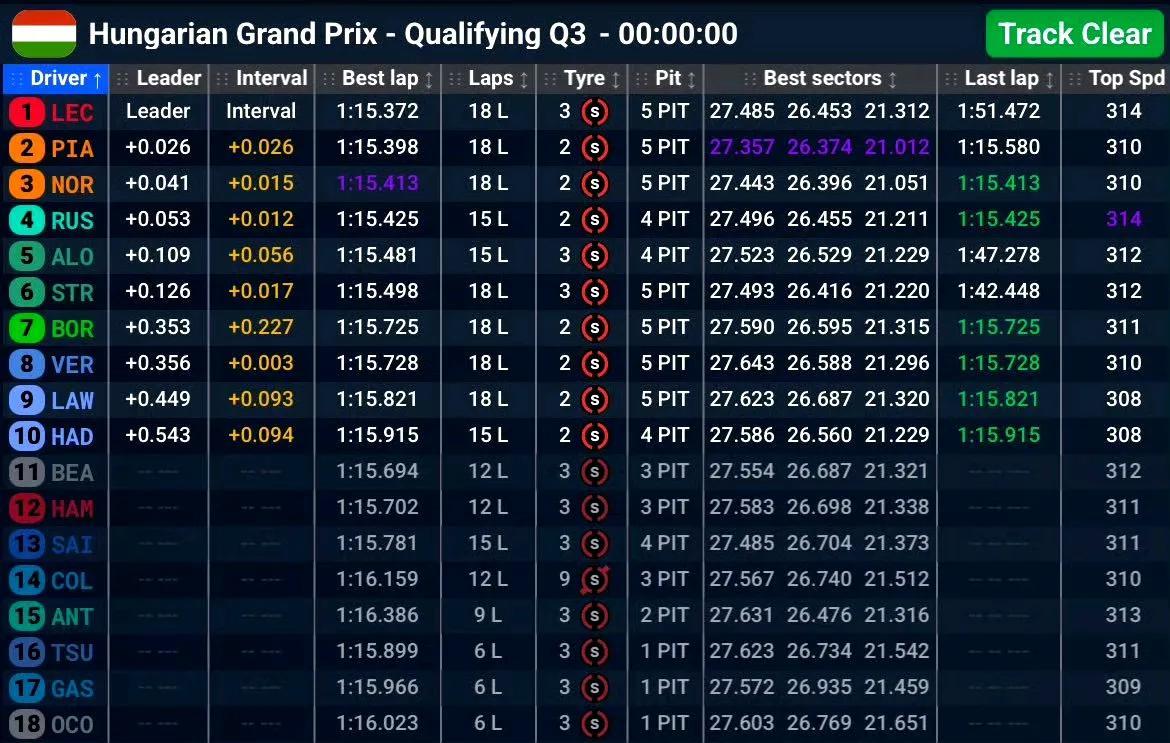 悲喜两重天!真的要被法拉利气死和笑死!同样维斯塔潘依旧很挣扎…… Q1Q2跑得非常挣扎的法拉利爆出大冷门,汉密尔顿又一次止步Q2,乐扣却以0.026秒的微弱优势夺得杆位。 迈凯伦两名车手分别排名第二第三。 维斯塔潘仅仅排名第八,角田Q1撞车退赛。 由于匈牙利赛道易守难攻,难道夏休前法拉利要结束无冠的尴尬?