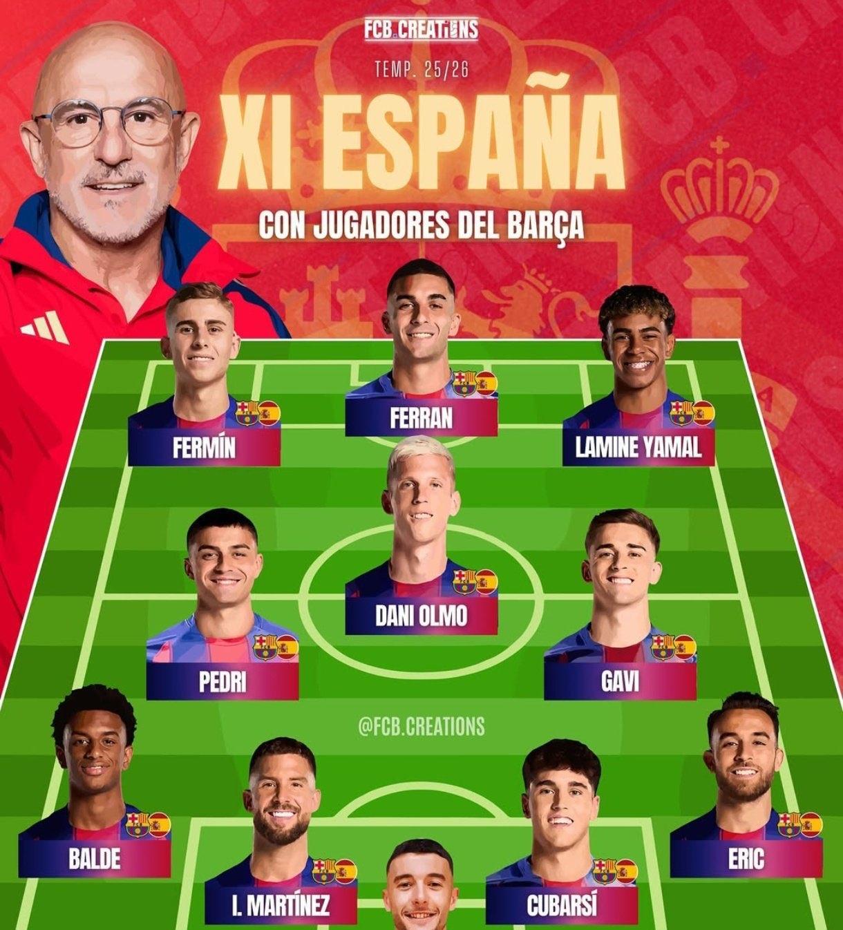 如今的巴萨可以组一套完全由西班牙球员构成的球队了。费兰-托雷斯,费尔明,亚马尔组成了前场三叉戟。 中场有奥尔莫,加维,佩德里。 后防线上则有霍安-加西亚,库巴西等名将。 历史证明当本土球员实力强时,巴萨的上限就高。这套阵容如果去踢世界杯,会是什么成绩呢?#头号创作者激励计划#