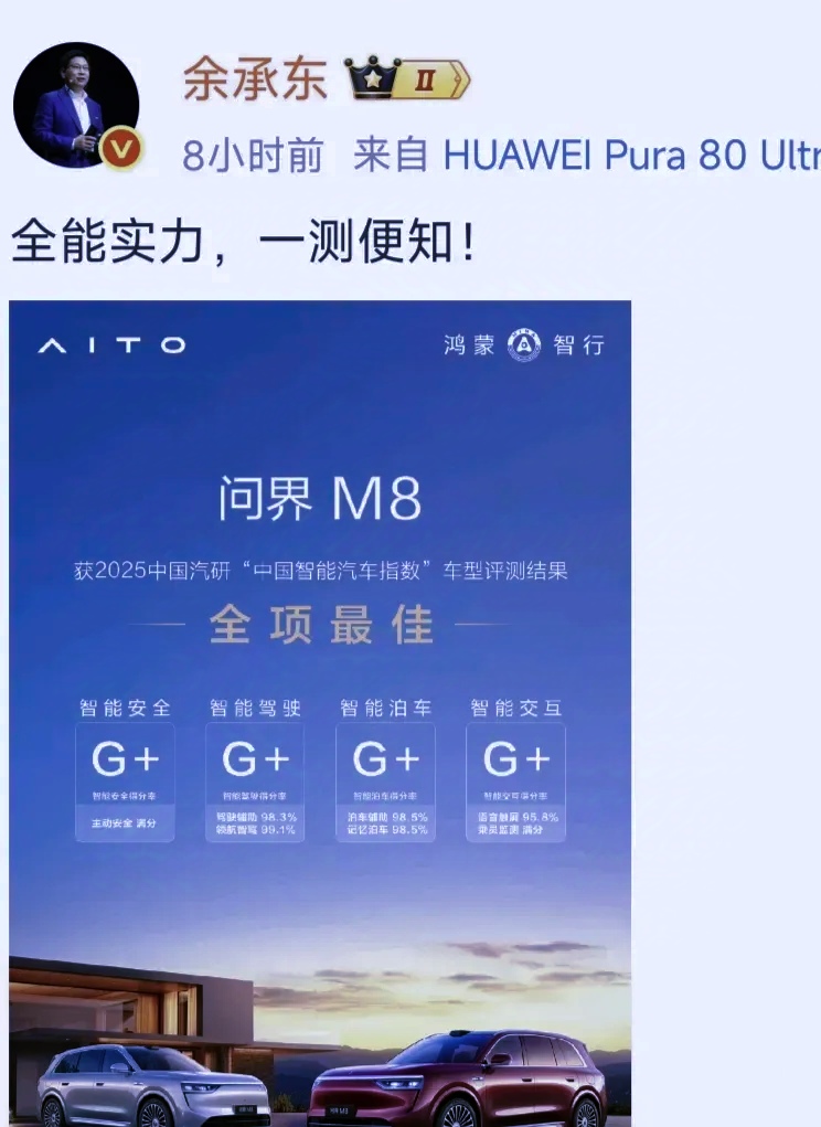 问界M8真是谁的面子都不给了,如果不是余承东说出来,估计多多人还蒙在鼓里!各大车企都在说自己的车身钢结构多么安全,车机系统多么流畅,智能辅助驾驶技术多么先进,还有的说拥有媲美L4的智能泊车技术…,反正一圈下来,谁都说自己是第一,消费者根本辨别不出来。然而中国汽研公布数据的那一刻,谁在说谎一目了然,如果不是余承东亲自转发,根本没有多少人知道这个测评结果,原来问界M8才是真正的第一,直接拿下四个G+,智能安全拿下满分,智能驾驶、智能泊车、智能交互的得分率全在98%以上,中国汽研给问界M8的评价是全项最佳。说白了,吹牛谁都会,但第三方机构一测,一个比一个安静,这一次余承东也不给友商任何面子,直接配文:全能实力,一测便知!