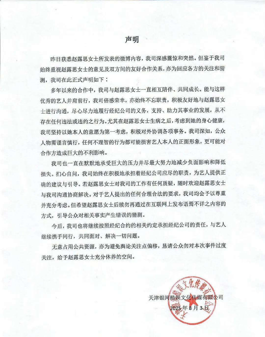 《针对赵露思发文,公司声明:惊于内容突然,称履行义务无违规并愿沟通解疑》