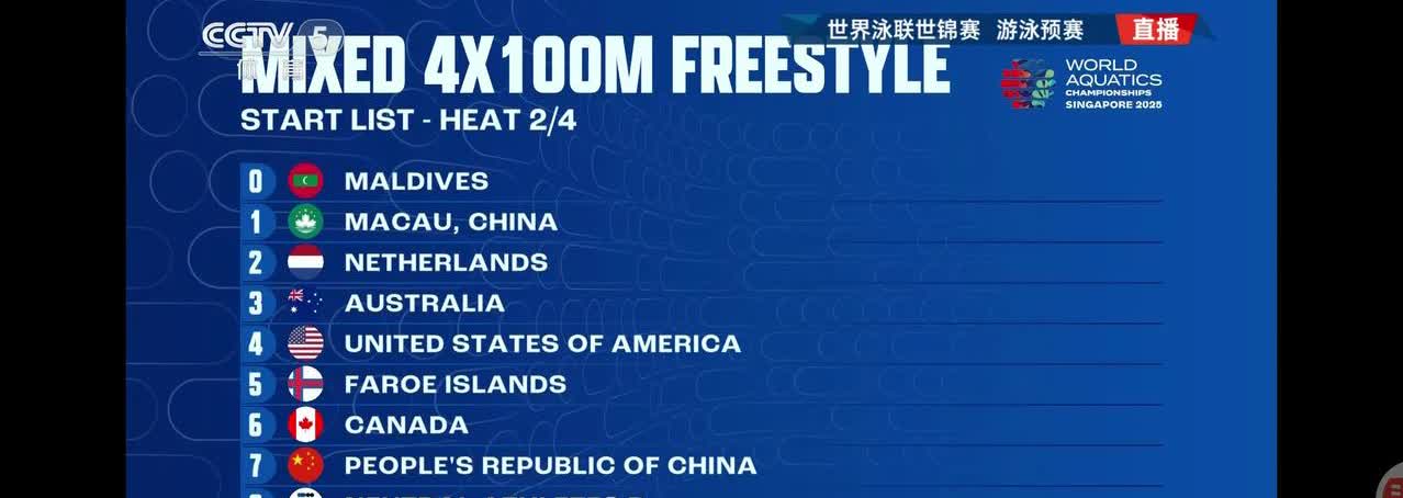 大意失荆州 2025新加坡游泳世锦赛 男女混合4×100米自由泳接力预赛 中国队没有派出主力,全替补参战,惨遭淘汰。 中国队第1棒是陈俊儿,排名第五 第2棒是王浩宇,追到第三 第3棒是余依婷,保持第三 第4棒是杨雯文,小组第五完成比赛。 中国队大意失荆州,未能进入决赛
