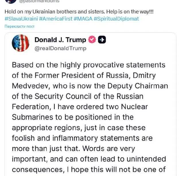 “挺住,我乌克兰的兄弟姐妹们!援助已经在路上了!”——特朗普的精神顾问伯恩斯这样写道,并附上了特朗普在Truth Social上关于派遣核潜艇的帖子。 特朗普此前曾声称,美国的核潜艇“离俄罗斯更近了”。与此同时,《纽约时报》报道称,潜艇的调动无法核实,因为这是五角大楼最机密的战术行动之一。