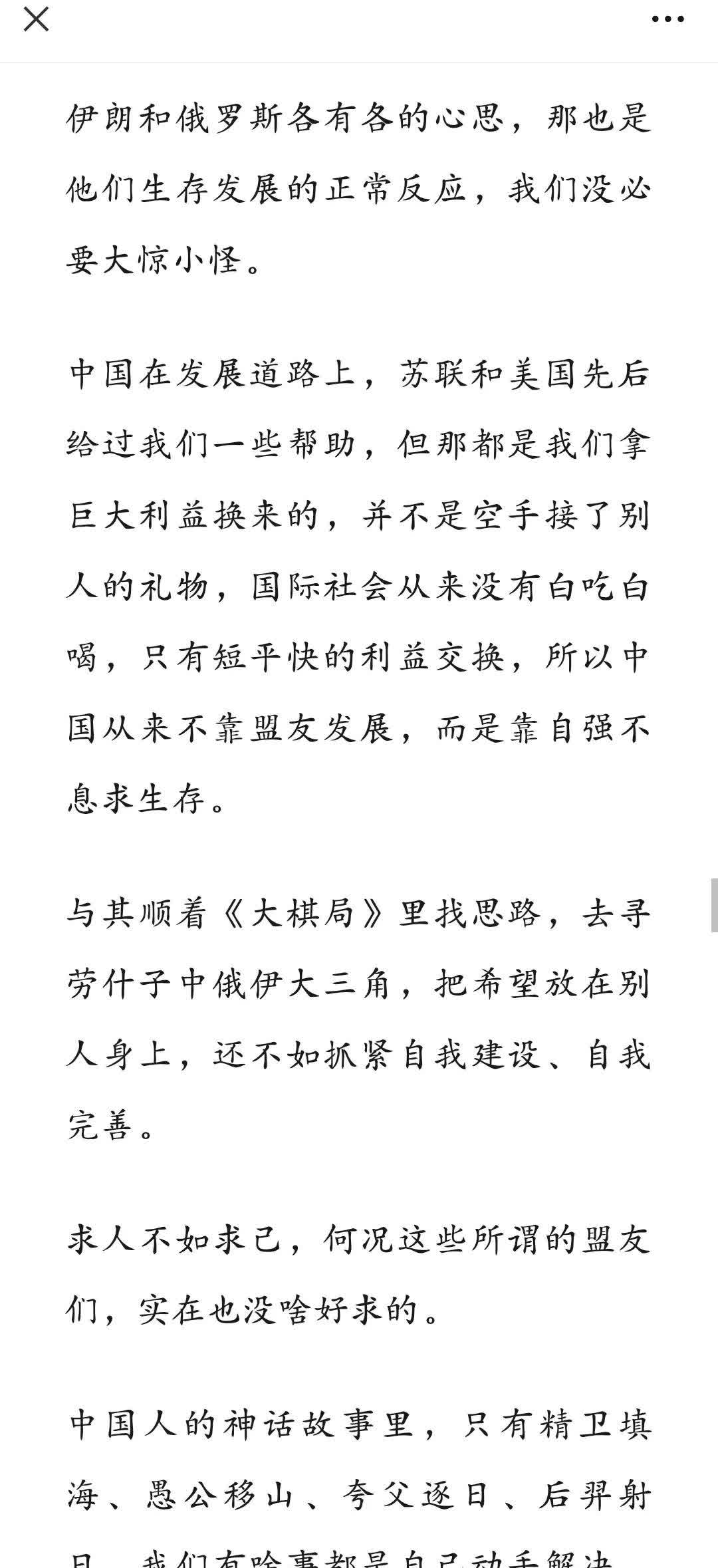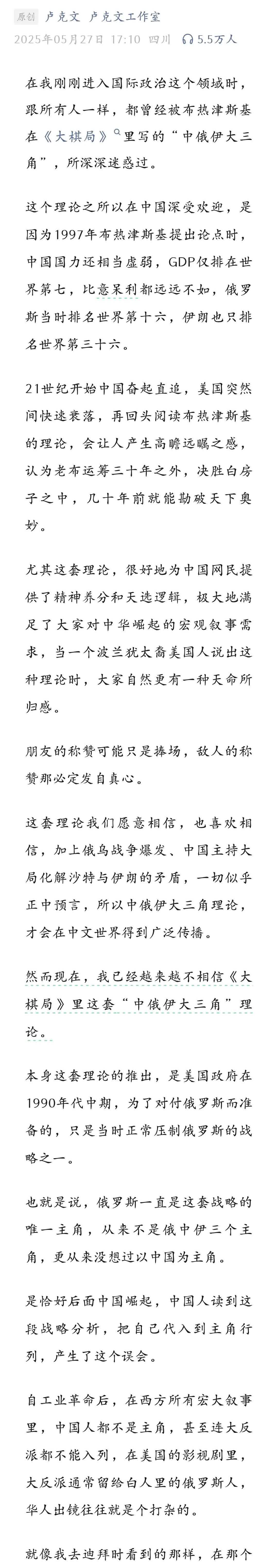 分析的特别正确,卢克文总算是把这层窗户纸给捅破了,现在我越来越不相信所谓的大三角了,要知道当初老布提出所谓的大三角,只不过是想劝说老美加大对大俄的制裁力度,我们和老伊只不过是配角,顺带提一句罢了。就在刚才阅读完了这篇《或许从来没有所谓的大三角》真正值得所有人励志的是我们自己,因为我们在这套理论中从配角闯出了一条主角的路,并不意味着我们要在这条路上继续走下去。 为什么卢克文会认为所谓的大三角根本没有实际的可行性,其实这个道理也非常简单,那就是这三个国家都具有非常独立自主的意识。你说其他两个国家为什么要牺牲自己的利益去配合我们,毕竟没有人能够保证即使我们之后了也会愿意带着他们两个,那既然如此,还不如各玩各的。毕竟我们和他们的诉求也没那么一致,所以平日里互相帮忙没什么大问题,现在要选择深度绑定,那恐怕还有好多步骤要走呢。