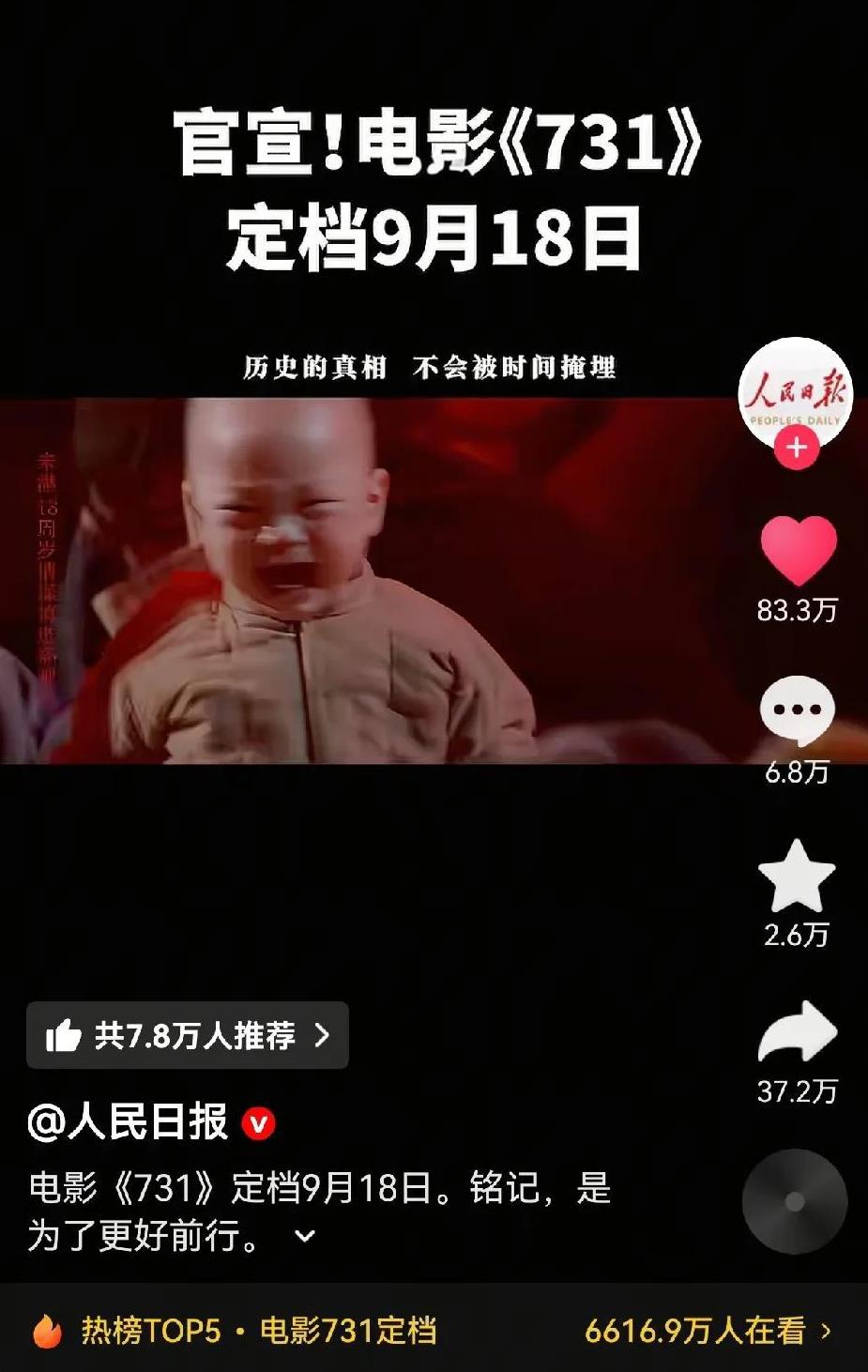 赢了,不仅会上映,而且还专门挑了个非常有意义的日子上映,9月18日《731》正式上映,官方认证,谁也无法阻止历史真相的播出。那些处心积虑的,打着放过孩子和不要伤害孩子的幌子的,想要阻止《731》上映的,想让我们的下一代淡忘这段历史的人,终究是会失败的。 冲吧,不愿跪着的人们,用我们的团结,把这部电影给冲上去,让他们知道,我们没有忘记历史,打消他们得非分之想。