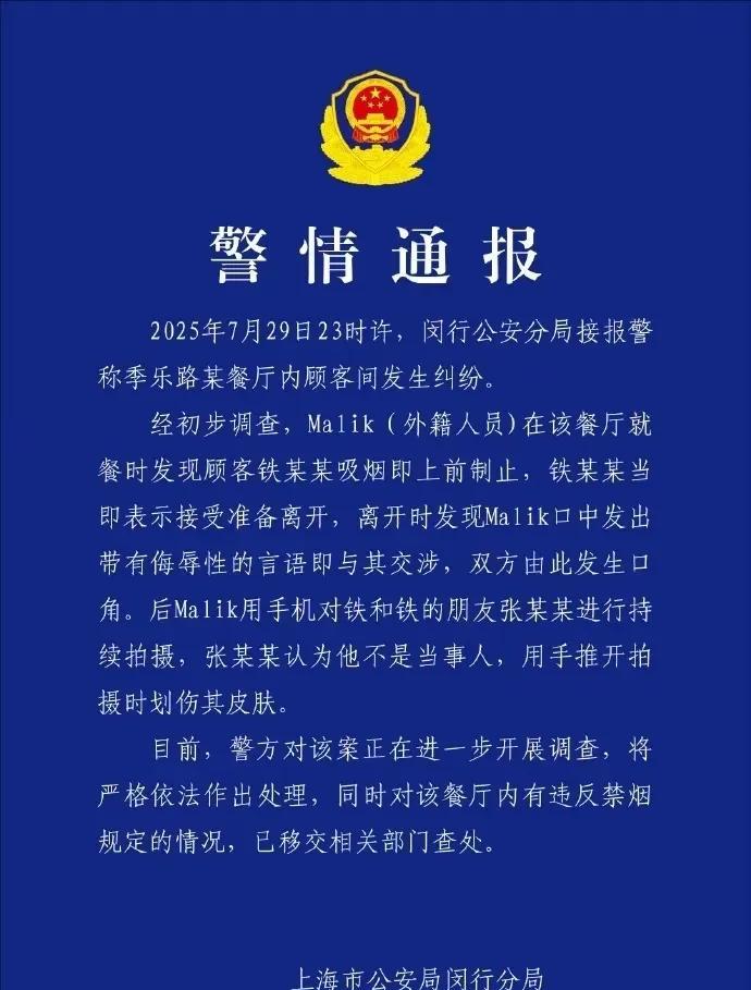 上海,一外籍小哥发现有人在餐厅吸烟,于是主动上前,指着禁烟标识,提示吸烟者不要吸烟,还拍摄视频发布出来。不料却遭到吸烟者同伙的阻拦,双方还为此发生冲突。警方及时作出通报,事情的真相原来是这样? 8月2日,据光明网报道,外国小哥在上海某餐厅劝阻吸烟者发生争执,警方已经作出了正式通报。 网传视频显示,7月29日,一外国小哥指着餐厅内禁止吸烟的标志,指责男子铁某等在餐厅吸烟。 从小哥拍摄的视频来看,铁某依旧站在原地,继续吸烟。 但铁某的朋友出手阻拦外国小哥,还强烈要求外国小哥关闭相机,随后还上前推小哥的镜头。 随后,双方就发生肢体冲突,还闹到了报警的地步。 事后了解得知,该外国小哥因多次发布在公共场所劝阻吸烟者的视频走红。 涉事餐厅的店长表示,按照规定,他们店里确实不能吸烟,店员发现会进行劝阻。 事发当时,外国小哥在提醒铁某等人禁止室内吸烟,店员看到后也进行了提示。 随后,铁某等人和外国小哥用英语说了几句就吵了起来,具体说了什么,店长表示他们也听不懂。 后来,双方发生了肢体冲突,民警到来后,已经进行了行政立案处理。 8月2日,上海市公安局某分局发布了正式警情通报,说清了事情的真相。 原来,外国小哥在该餐厅就餐时,发现顾客铁某吸烟就赶紧上前制止,铁某当即表示接受准备离开。 外国小哥还是喋喋不休,还拿着手机拍摄铁某和朋友,双方这才发生口角。 后来,外国小哥继续用手机对铁某和朋友张某进行持续拍摄,张某认为他不是当事人,用手推开拍摄时,不小心划伤了张某的皮肤。 双方因此发生肢体冲突,闹到了报警的地步。 目前,警方表示会对案件进一步开展调查,并严格依法作出处理。 对于该餐厅内违反禁烟规定的情况,公安机关已经移交给相关部门查处。 对于此事,从法律角度应该如何看待呢? 首先,铁某违反控烟条例固然有错,但外国小哥劝阻也要注意方式。 《上海市公共场所控制吸烟条例》第六条规定:室内公共场所、工作场所、公共交通工具内禁止吸烟,电子烟同样适用;个人有权要求吸烟者停止吸烟,并可向监管部门举报场所管理方不作为。 铁某在餐厅内吸烟已违反控烟条例,餐厅作为管理方虽事后提示,但未能及时有效制止,依法可被监管部门处罚。 外国小哥的劝阻行为本身合法,但需注意方式合法性。 此外,若持续拍摄非公开场景且未获当事人同意,可能涉嫌违反《民法典》第1019条侵害肖像权,但出于公共场所监督的合理目的,司法实践中可能予以宽容。 其次,冲突责任需要根据过错程度划分,拍摄与推搡均可能担责。 张某因被非当事人拍摄而推拒镜头属于自我保护,但其行为需控制在合理限度内。 警方最终处理很可能要综合双方过错程度,可能依据《治安管理处罚法》第43条对动手者处以罚款或拘留,同时通过调解解决民事赔偿。 如果故意借此博取流量,那就偏离了事情的本质,外国小哥恐怕也要为此付出一定的代价。 关注@蜜蜂说法 ,多学法律少吃亏。 #头号创作者激励计划#