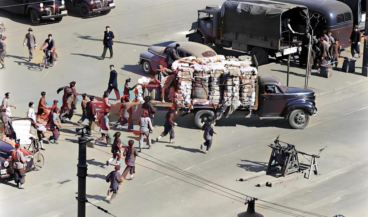 警察抓小偷。1948年,上海。一名肥头大耳的警察捆绑着一对衣衫褴褛的母女,恶狠狠地拖拽她们到警察局接受惩罚。身后有许多围观者在嬉笑,更增添了几分讽刺与荒诞。这些警察都是来自于好吃懒做、偷鸡摸狗之徒,他们在街上鱼肉百姓,欺压良善,可谓作恶多端,民众敢怒不敢言,在后面骂他们是“黑皮”。p2:饥民纷纷涌向卡车拉扯棉花;p3:两名女子偷盗棉花被警察当场抓捕,在寒冷的冬天,其中一名妇女穿的却是短裤。 1948年,蒋家王朝依旧占据着上海,然而在国民党的黑暗统治下,上海乌烟瘴气一片混乱。通货膨胀、物价飞涨、民不聊生。这对母女家里几天都揭不开锅了,到码头偷盗棉花换钱买粮食,不幸被警察抓捕。 不过当民国警察也是不容易的,他们的职能比现在的警察更多,尤其是早期租界巡捕,既要管治安,还要负责清扫大街、管交通,可谓是“全能警察”,这样的警察你干吗?#牢记历史爱我中华# #分享真实的历史#