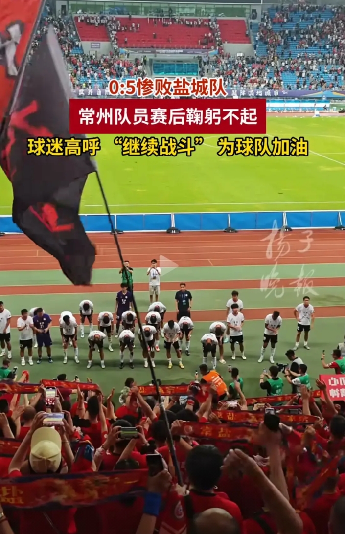 这是中国足球难得看见的一幕,苏超常州队员向观众长时间鞠躬,令人动容。球员知耻必然后勇,球迷宽容必然和谐。只要多一份耐心,多一份磨练,多一份支持,相信常州一定会赢,中国足球一定会赢。