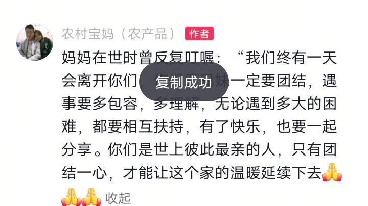 堂嫂今天的视频引起了善良人的动容! 堂嫂说: 妈妈的离开,让这个大家庭更团结! 妈妈曾嘱咐,你们五兄妹一定要团结,遇事要多包容,多理解,无论遇到多大的困难,都要相互扶持! 堂嫂的母亲是意外离开的,就是堂嫂去景德镇那段时间,难怪匆匆回来,因为家里有这种事,言宝 也没办法去堂嫂家了! 堂嫂以后要多做善事,想卖货要凭自己的本事才行!