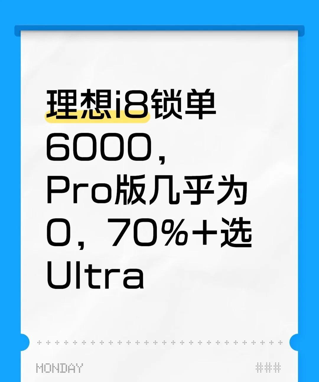 理想应该砍掉 i8 的 pro版,然后降 5 万 刚看了孙少军的直播 理想i8目前锁单大约6000台 Pro版几乎为0 Max版20%+ Ultra版70%+ 我还是重复我的观点 直接砍掉Pro版 然后max和ultra直降5万 这样Max版,29.98万 Ultra版,31.98万 估计能爆一波【来自懂车帝车友圈】