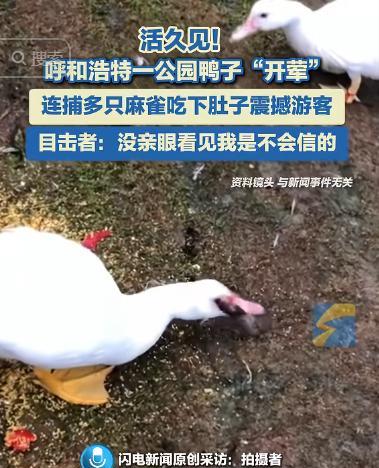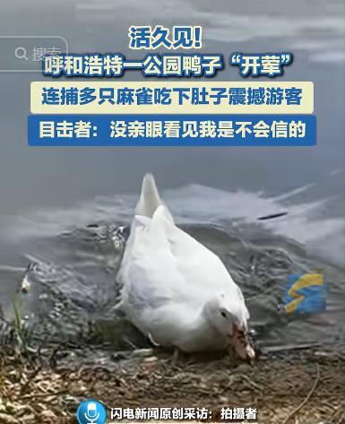 “解释不清了!”内蒙古呼和浩特,男子在公园发现一群麻雀,正准备拿手机拍,不料,一只鸭子突然从水里冲出来,猛冲上前咬住麻雀后一口吞下,接下来又吞掉第二只,拍摄者很迷惑:一直以为鸭子很和善…… 据闪电新闻8月3日报道,刘先生(化名)在呼和浩特的公园里面,看见了一群小麻雀正在觅食,于是便拿出手机想记录这画面,但让他没想到的是,一只看似温顺的野鸭会在下一秒打破这份恬静。 视频里,这只体态略显粗壮、头顶带着一撮深色羽冠的野鸭,从水草丛中突然加速冲出,它在水面上划出一道直线,径直扑向那几只还没来得及警觉的麻雀。 紧接着,它猛地张口,一口咬住一只麻雀的后颈,将麻雀甩向空中,又稳稳接住,看都不眨眼,就这样迅速地一只接一只吞下。 围观者忍不住发出惊呼,震惊之余,有人连忙用手机拍摄,画面里,鸭子每次都咬得精准,根本不给麻雀任何求生的机会,那几只麻雀还没完全反应过来,就被命中要害,随即被拖入它那阔大的喙中,消失于湖面涟漪之下。 其实,野鸭捕食小鸟并非罕见,在湿地生态中,某些体型较大的野鸭,尤其是家鸭的野生后代或混血个体会猎捕小鱼、蛙类,甚至小型鸟类。 它们的喙不仅能过滤水草,也足以咬碎小型猎物,只是在城市公园这个“放养”背景下,我们很少看到它们行动迅捷的一面。 任何动物,都在不断适应环境、寻求生机,弱小与温顺并不代表永远被动。