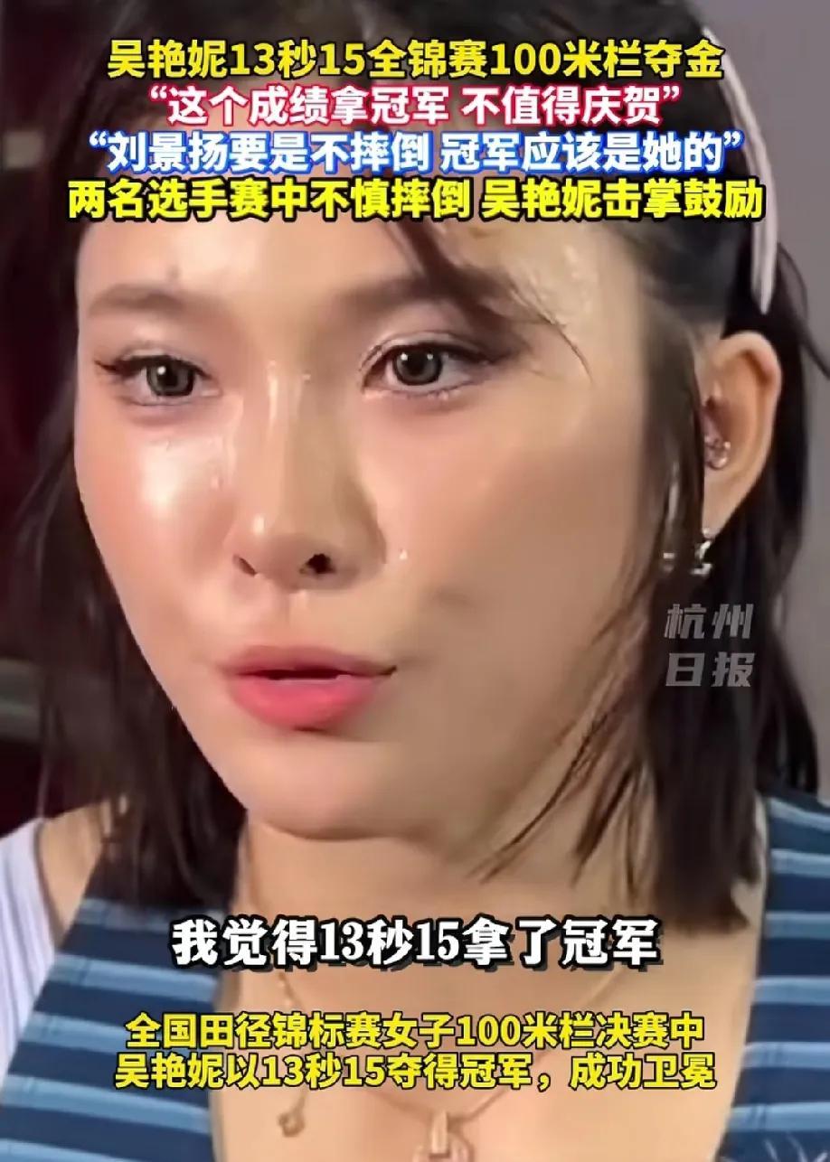 吴艳妮在100米跨栏全锦赛夺冠后的第一句是:13秒15拿冠军,我开心不起来。 我前面的刘景扬跑的很好。 她要是不摔倒,这个第一名应该是她的。所以我觉得拿到第一名,也不值得庆贺,还得要继续加油。