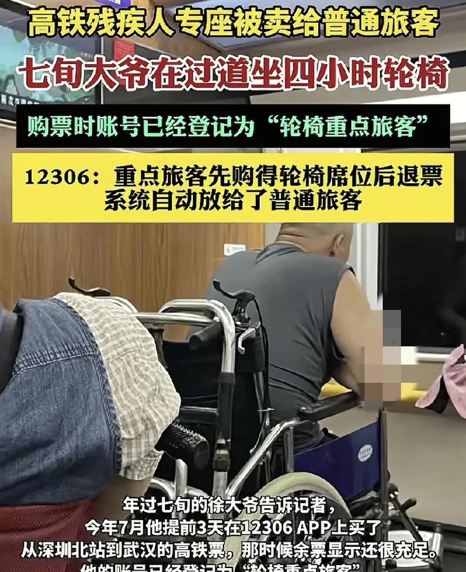 七旬大爷购买了从深圳北开往武汉的高铁票,当时在购票平台选择的是残疾人专座,并同意了随机分配其他座位。然而到了列车上,他发现自己所在的座位并非是残疾人专座,而被迫坐在过道里4个小时。而这些残疾人专座有好几个都是普通的旅客,12306对此回应称,由于残疾人创专座有旅客已经购买了票,但是后来退票了,系统就转到转给了普通的旅客,现在正值是暑期运力比较紧张的时候,所以会有这样的情况。