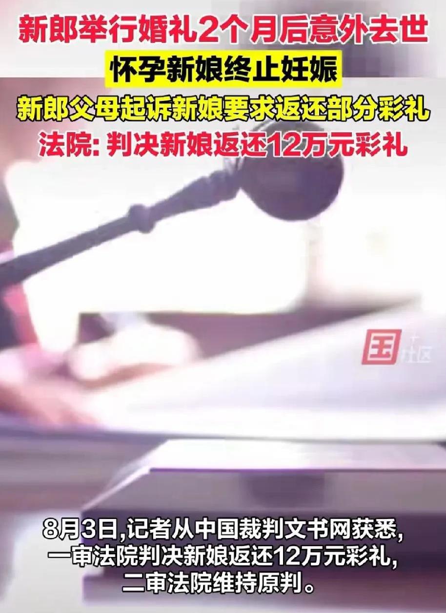 河南邓州,女子和男友同居怀孕后,双方按照农村习俗举办了婚礼,男方给了26.6万彩礼,还花2.6万元购买三金,只是没有领证。两个月后,男友因意外离世,女子瞒着男方父母悄悄打掉孩子。男方父母得知后,把女子告上法庭,要求退还彩礼,法院判了! 8月3日,极目新闻报道了一则彩礼纠纷的案例,婚礼两月后新郎意外离世,新娘终止妊娠后,彩礼纠纷引发大家关注。 男子郭某和牛女士是自由恋爱走到一起的,2023年9月,两人怀着对未来的憧憬,开始同居生活。 同居三个月后,牛女士发现自己怀孕了,这个消息让小两口既惊喜又紧张。 2024年3月,按照农村的习俗,他们热热闹闹地举行了婚礼,亲朋好友都来祝福,郭某和牛女士脸上洋溢着幸福的笑容,仿佛看到了美好的未来在向他们招手。 为了能顺利缔结这段婚姻关系,男方父母拿出了多年的积蓄,给牛女士支付了26.6万元的彩礼,还花费26290元为她购买了“三金”。 郭某父母想着,只要孩子们能好好过日子,这些付出都是值得的。 然而,命运却跟他们开了一个残酷的玩笑。 2024年5月15日,一场意外突然降临,郭某不幸去世。 这个噩耗如同一道晴天霹雳,让牛女士陷入了巨大的悲痛之中,她无法相信那个曾经与自己朝夕相伴的人就这样离开了。 郭某父母更是悲痛欲绝,白发人送黑发人的痛苦让他们几乎崩溃。 郭某去世后,双方父母和媒人曾一起劝说牛女士把孩子留下,毕竟这是郭某留下的血脉。牛女士当时也心软了,想着这是她和郭某爱情的结晶,便答应了下来。 可后来,牛女士独自承受着失去爱人的痛苦,还要面对未来独自抚养孩子的压力,她的内心无比挣扎。 经过内心的煎熬和挣扎,2024年6月底,牛女士还是独自前往医院终止了妊娠。 郭某父母得知此事后,心里十分不是滋味,他们家族唯一的血脉传承断了。 他们觉得既然孩子没了,而且两人也没办理结婚登记,牛女士就应该返还一部分彩礼。 于是,他们向法院起诉,要求牛女士返还15万元彩礼。 对于此事,法院会如何认定呢? 《最高人民法院关于适用〈中华人民共和国民法典〉婚姻家庭编的解释(一)》第五条规定:当事人请求返还按照习俗给付的彩礼的,如果查明属于以下情形,人民法院应当予以支持:(一)双方未办理结婚登记手续…… 郭某和牛女士按照农村习俗举行了婚礼,但并未办理结婚登记手续。 从法律层面来看,他们之间的婚姻关系并未得到法律的正式认可。 男方父母基于缔结婚姻的目的向牛女士支付了26.6万元彩礼以及购买“三金”花费26290元,当双方未达成法律意义上的婚姻关系时,男方父母请求返还彩礼具有明确的法律依据。 司法实践中,法院通常会综合考虑双方共同生活的时间长短等因素来确定彩礼返还的具体数额。 郭某和牛女士自2023年9月开始同居生活,至2024年5月郭某去世,共同生活时间相对较短。 由于共同生活时间不长,牛女士从婚姻关系中获得的长期利益相对较少,因此法院在判决时,会倾向于支持男方父母要求返还部分彩礼的诉求。 但同时,法院也会考虑到双方已经共同生活了一段时间,并非完全没有形成一定的婚姻生活状态,所以不会判决牛女士全额返还彩礼。 法院在判决时充分考虑到这一特殊情况,认为牛女士在这种情况下承受了更多的痛苦和压力,从公平和人道主义的角度出发,应当酌情减轻她的彩礼返还责任。 如果要求牛女士全额返还彩礼,对她而言显失公平,也不符合保护妇女权益的法律精神。 《民事诉讼法》第七条规定:人民法院审理民事案件,必须以事实为根据,以法律为准绳。 在本案中,法律并未对彩礼返还的具体数额给出精确的计算标准,而是需要法院根据案件的具体情况进行综合判断。 一审法院经过审理认为,男方父母要求返还彩礼符合法律规定。不过,考虑到牛女士怀孕又终止妊娠,身心都受到了影响,法院酌情减轻了她的返还责任,最终判决牛女士返还男方父母12万元彩礼。 牛女士对这个判决结果并不满意,她觉得自己也承受了很多痛苦,于是提起了上诉。 8月3日,河南南阳市中级人民法院作出了终审判决,驳回了牛女士的上诉,维持原判。 这场纠纷虽然画上了句号,但留给两个家庭的伤痛,却难以在短时间内抚平。 关注@蜜蜂说法,多学法律少吃亏!