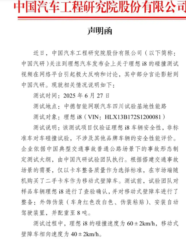 4、但是当大家都在等这场直播的时候,理想和中国汽研同时在8月3日发声了。其实说白了理想就是很硬气,到现在只字不提重新复测的事情了。关键一句道歉都没有,就说自己属实是无心之举!无意做出来质量结果论断!